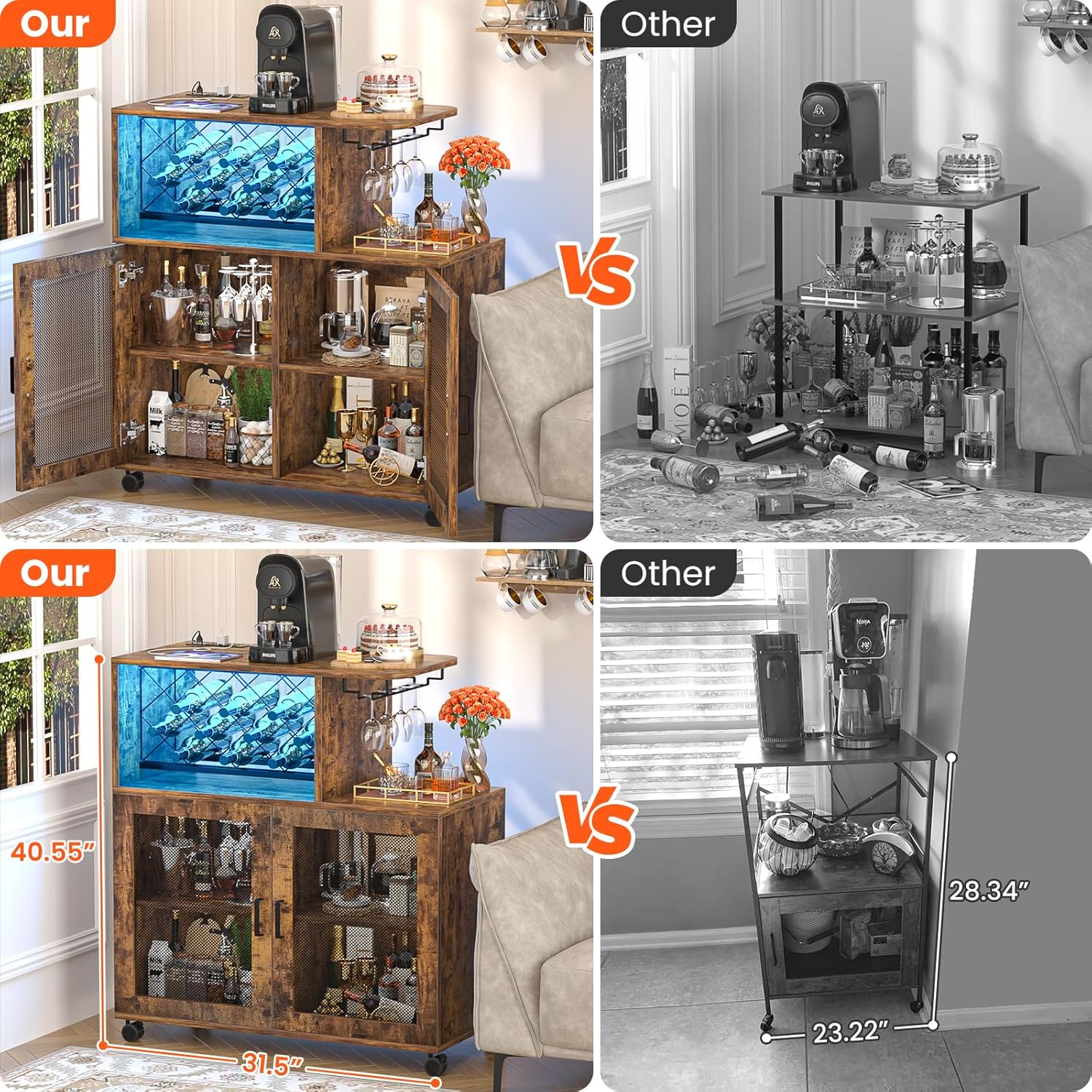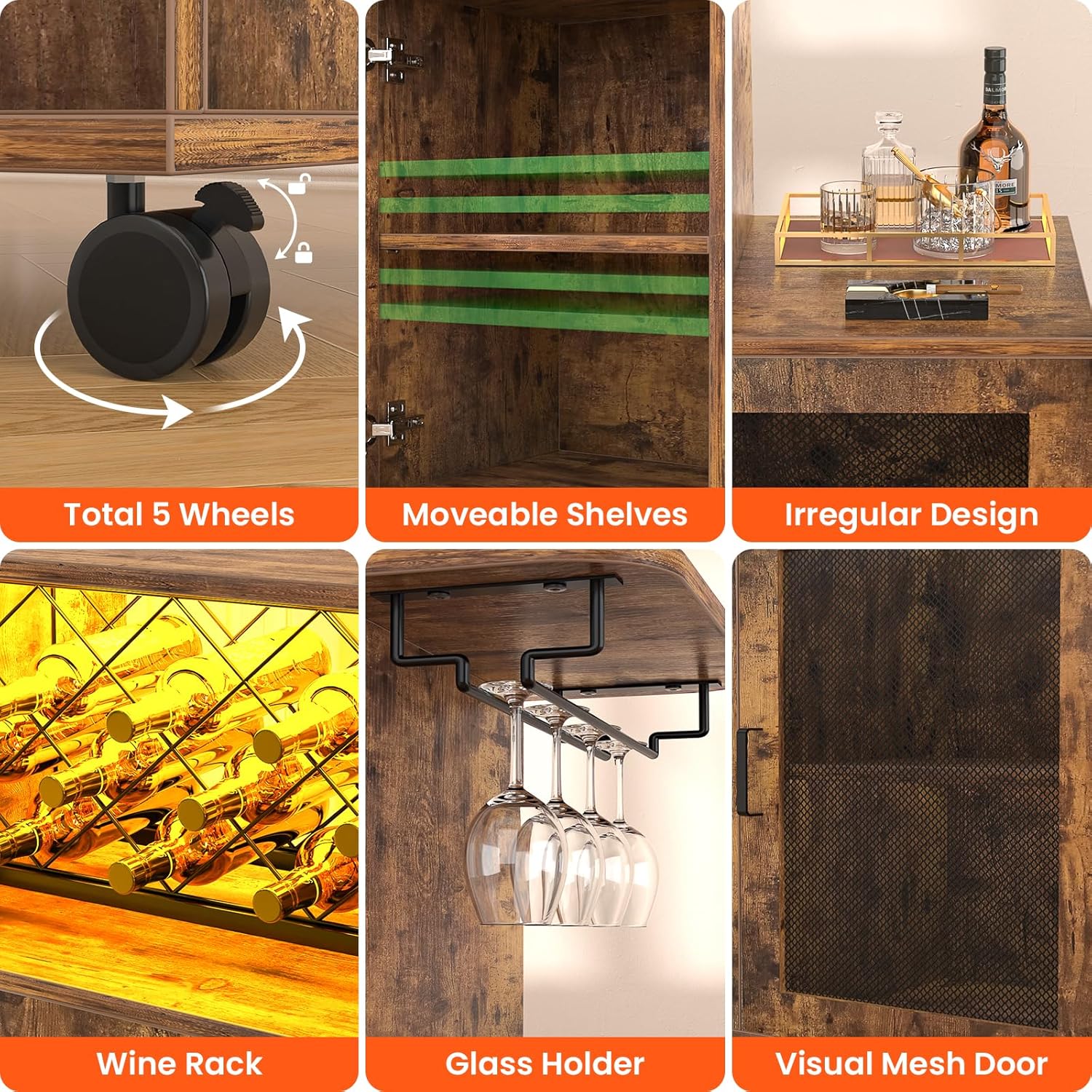 - 🍾Small Wine Bar Cabinet: Compared to other bar cabinets with a height of 28.34 ", the Girapow small bar cabinet with a height of 40.55" is ideal for placing next to the sofa as a coffee bar cabinet or as a mini home bar in the living room. There are a total of 5 wheels at the bottom, which improves stability while making it easier to move the cabinet.