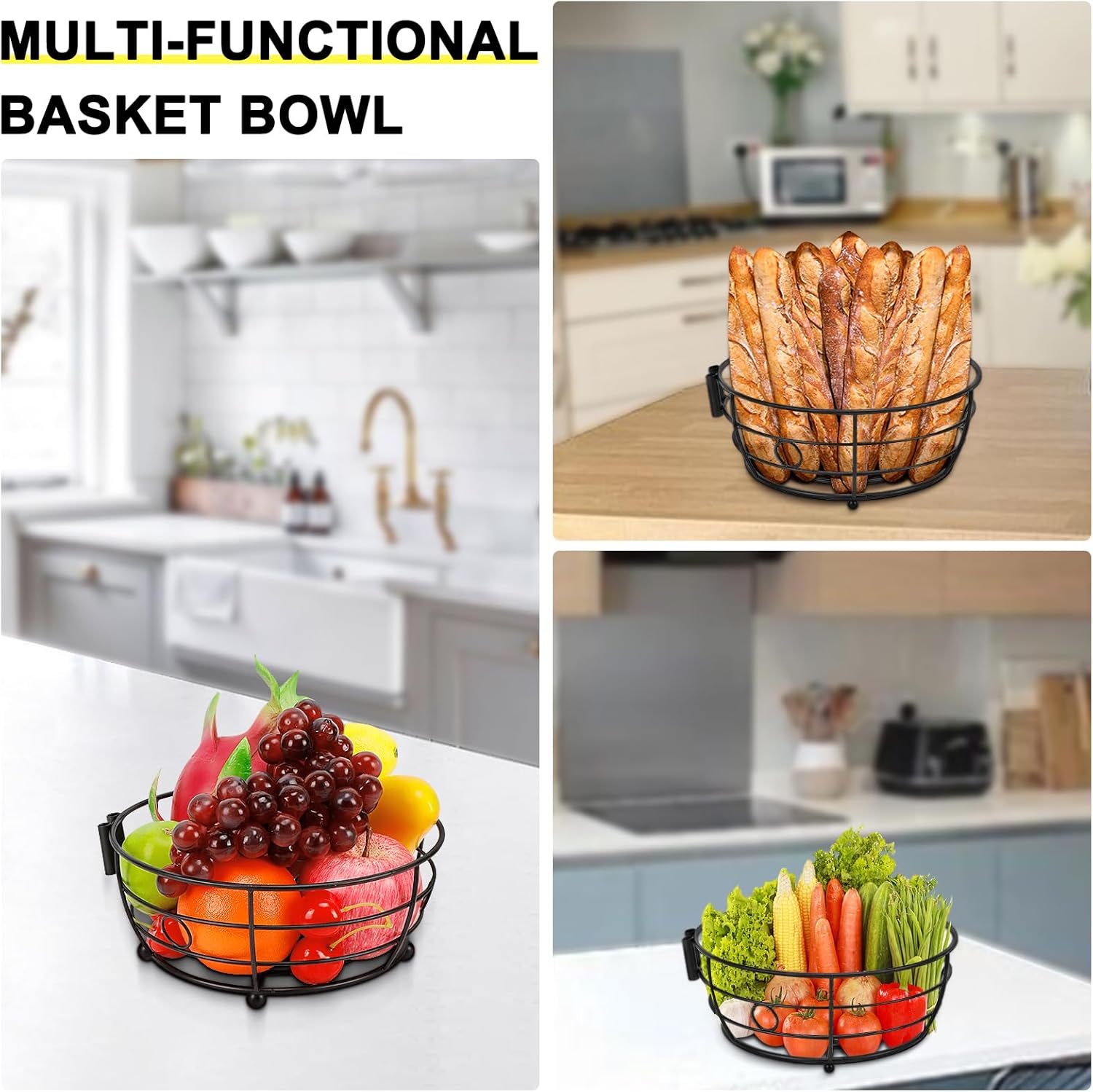 - PERFECT FRUITS STORING: The extra fruit basket bowl is ideal for your apples, pears, grapes, oranges,kiwis, snacks, bread and vegetables. Saving your countertop space and keeping your fruits fresh in your table kitchen.