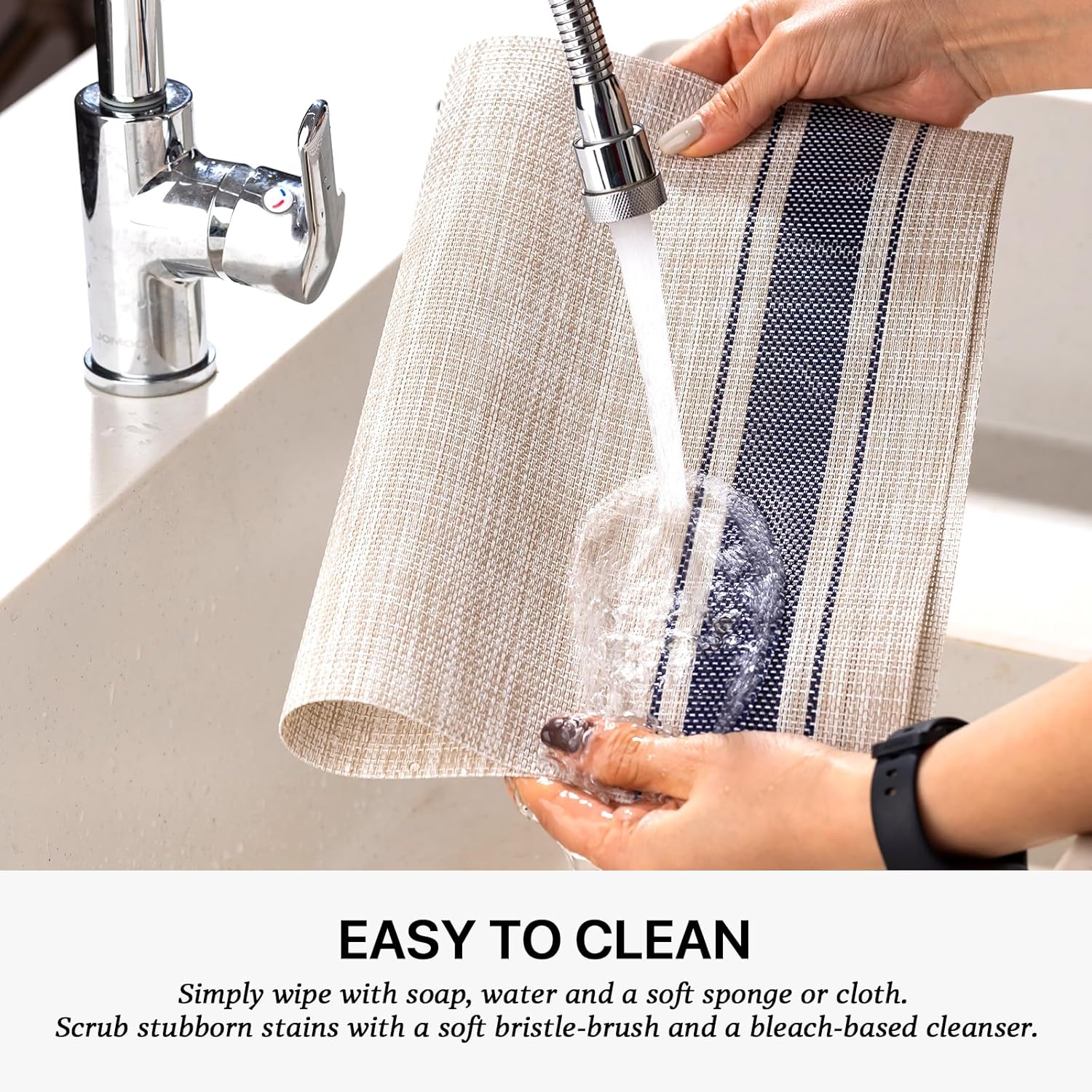 - EASY TO CLEAN:The washable placemats can be washed repeatedly.How to clean the place mats for kitchen table:Simply wipe with soap,water and a soft sponge or cloth.Scrub stubborn stains with a soft bristle-brush and a bleach-based cleanse.