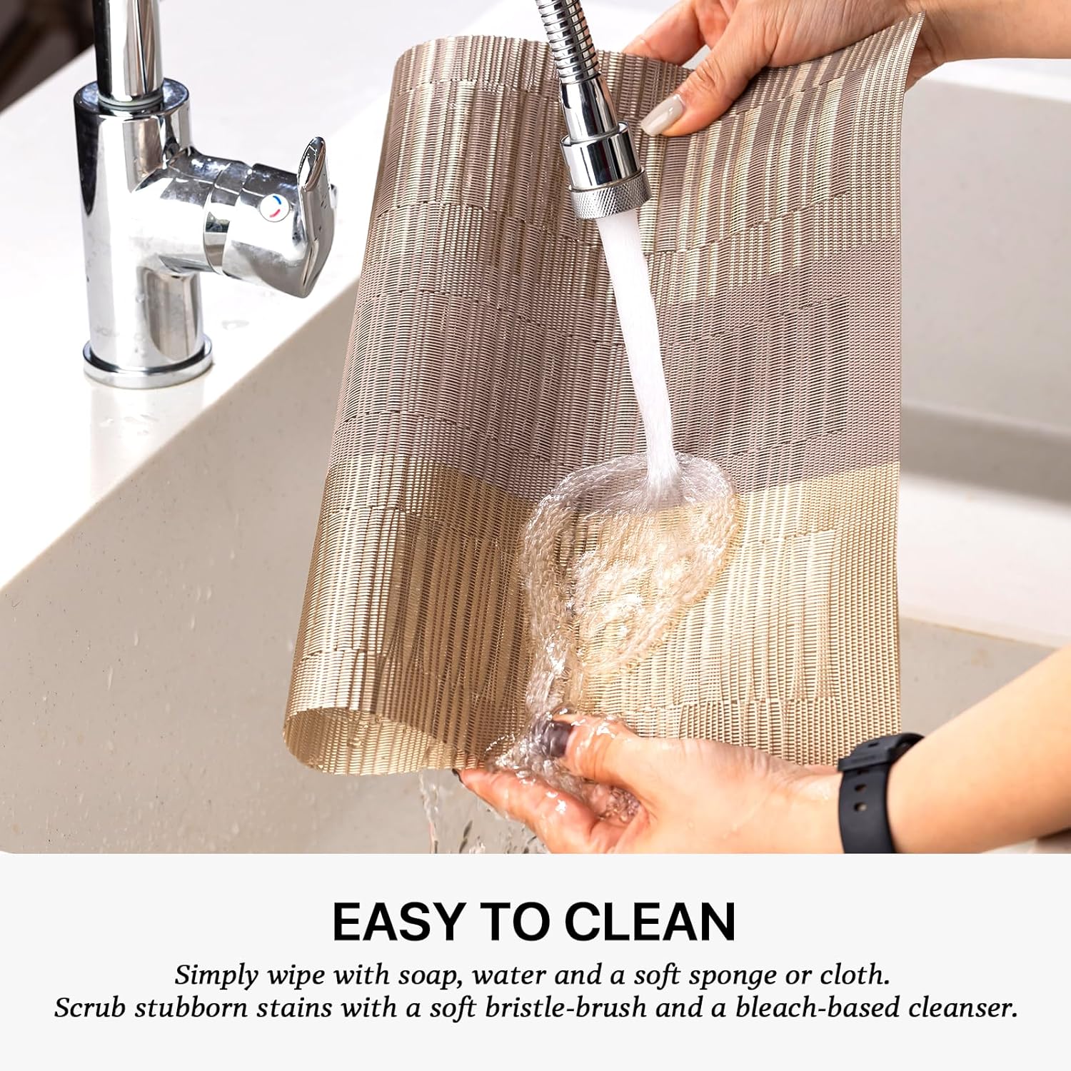 - EASY TO CLEAN:The washable placemats can be washed repeatedly.How to clean the place mats for kitchen table:Simply wipe with soap,water and a soft sponge or cloth.Scrub stubborn stains with a soft bristle-brush and a bleach-based cleanse.