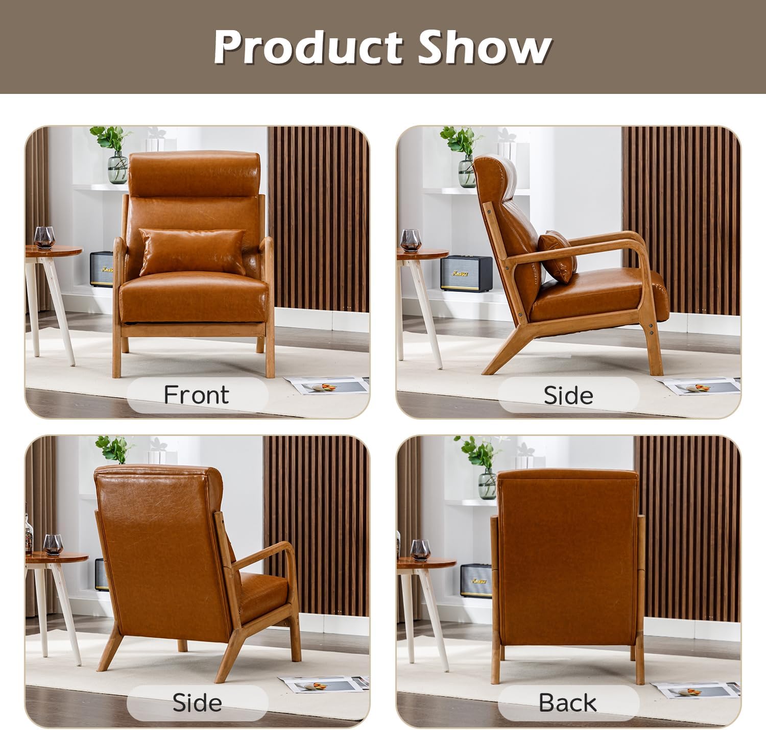 INZOY Mid Century Modern Accent Chair Set of 2, High Back Reading Armchair with Wood Frame, PU Leather Living Room Chairs with Waist Cushion, Single Lounge Arm Chair for Bedroom Sunroom, Camel