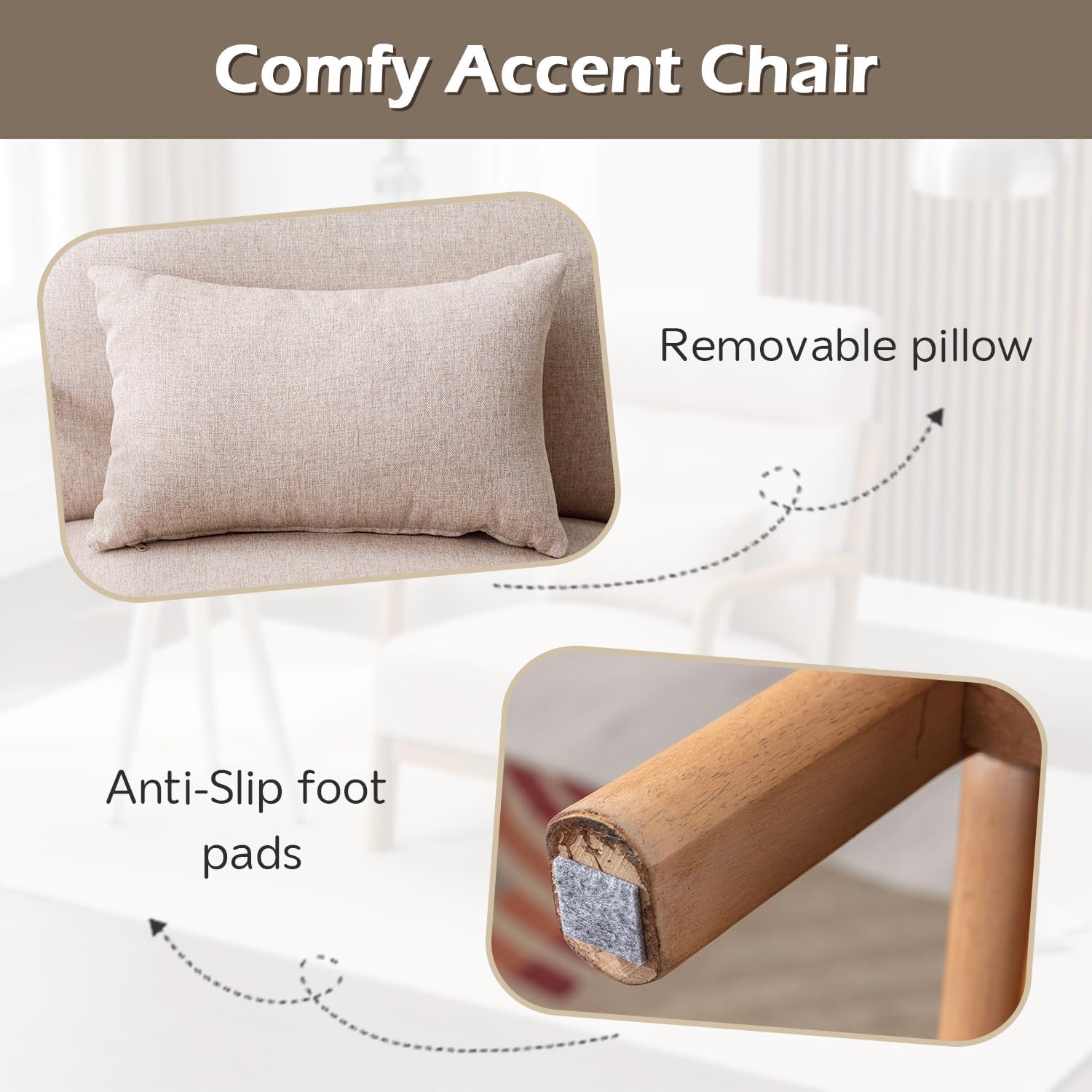 INZOY Mid Century Modern Accent Chair with High Back, Upholstered Living Room Chairs with Waist Cushion, Wood Frame Reading Armchair for Bedroom Sunroom, Beige