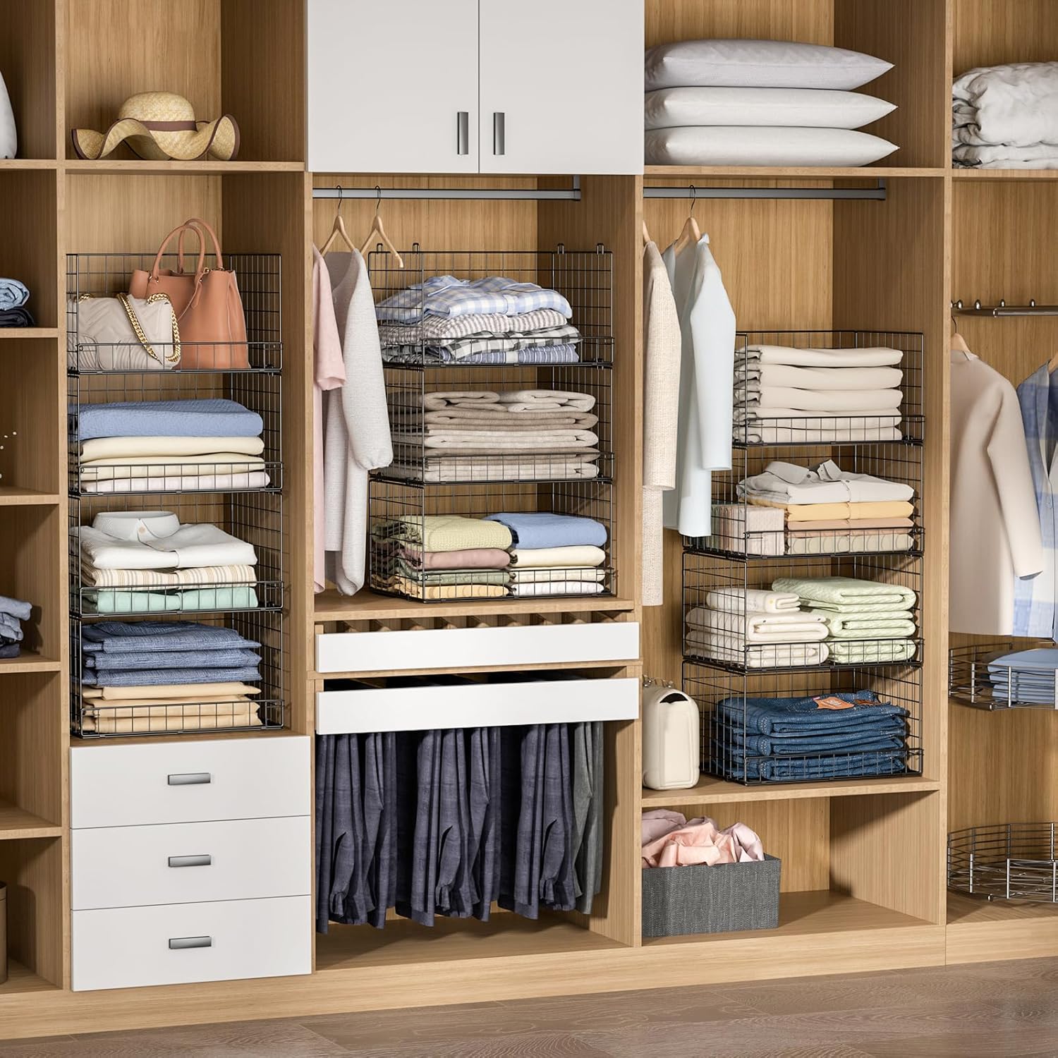 - 【Sturdy Iron Mesh】Made of premium iron mesh,these closet storage bins are sturdy,durable,breathable,visible,no smell and washable.Would not bend or damage like plastic or cloth storage baskets. You can count on it is strong enough and has a good craft.