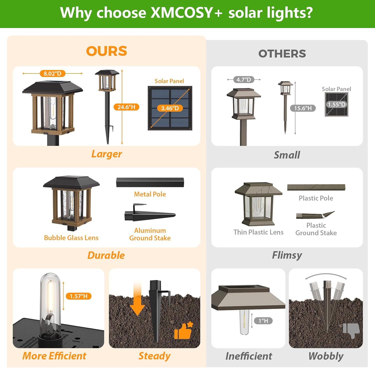- Durable All-Season Landscape Lights: Weatherproof die-cast aluminum construction with anti-corrosion coating and stable aluminum ground stake. These solar walkway lights endure -4°F to 140°F temperatures and withstand rain, snow, and UV exposure., hail, and snowstorm conditions year-round. No wiring needed - install anywhere in seconds. Dimensions: 5.75”W x 24.6”H.