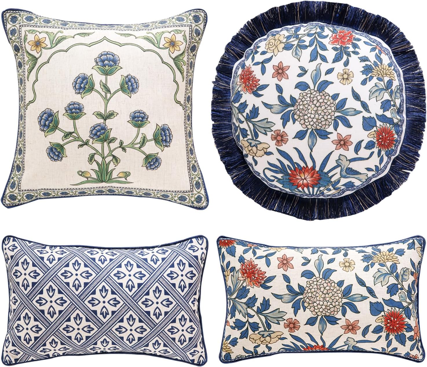 patdrea Designer Floral Linen Throw Pillow Covers,Blue French Cottage Flower Pattern Decorative Pillowcases Cushion for Bed Living Room Outdoor Car,Pack of 4