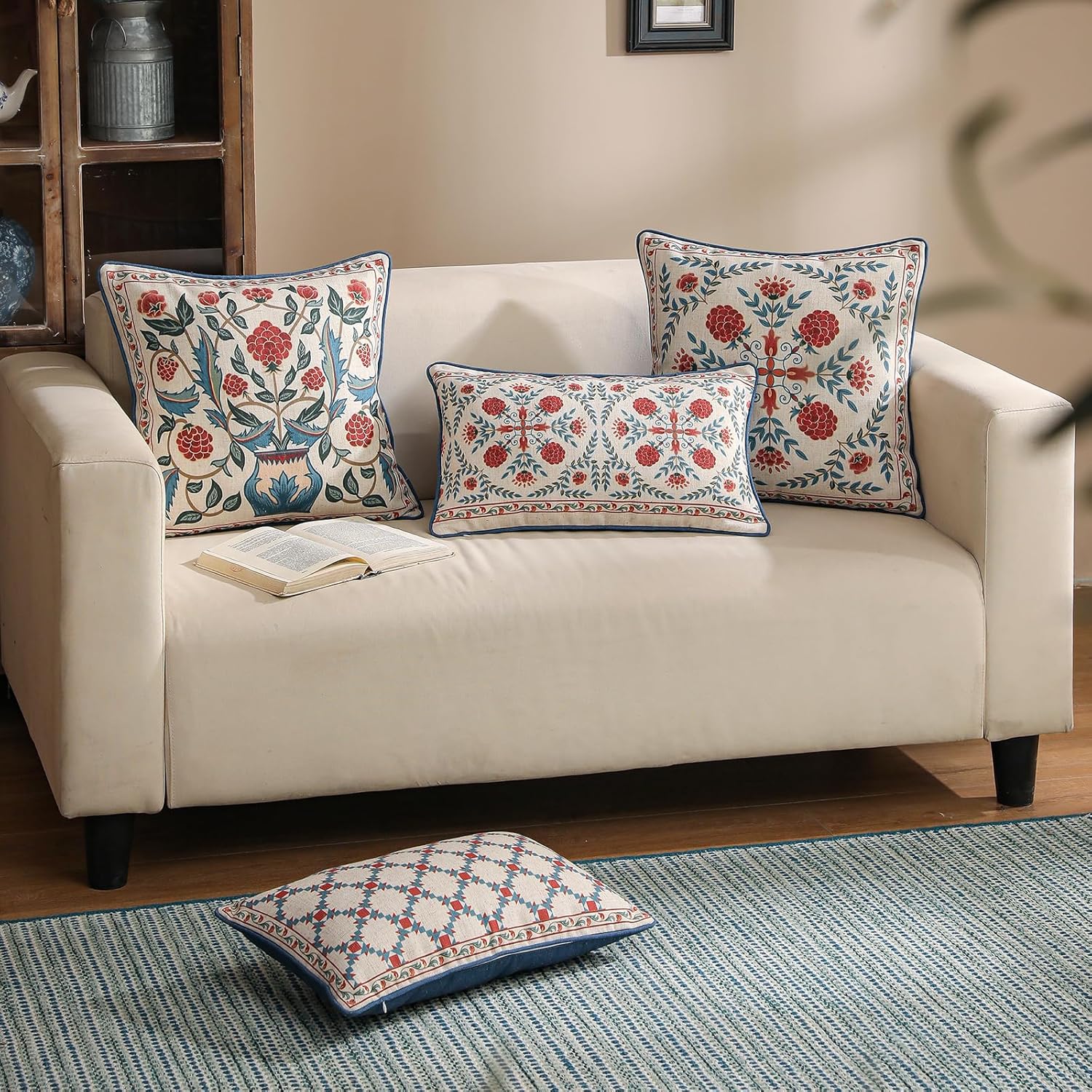 patdrea Designer Throw Pillow Covers Set of 4,Brilliant Vintage Red Tropical Linen with Floral Pattern Pillow Cover,Decorative Lumbar and Square Pillowcases Cushion for Bed Living Room Outdoor