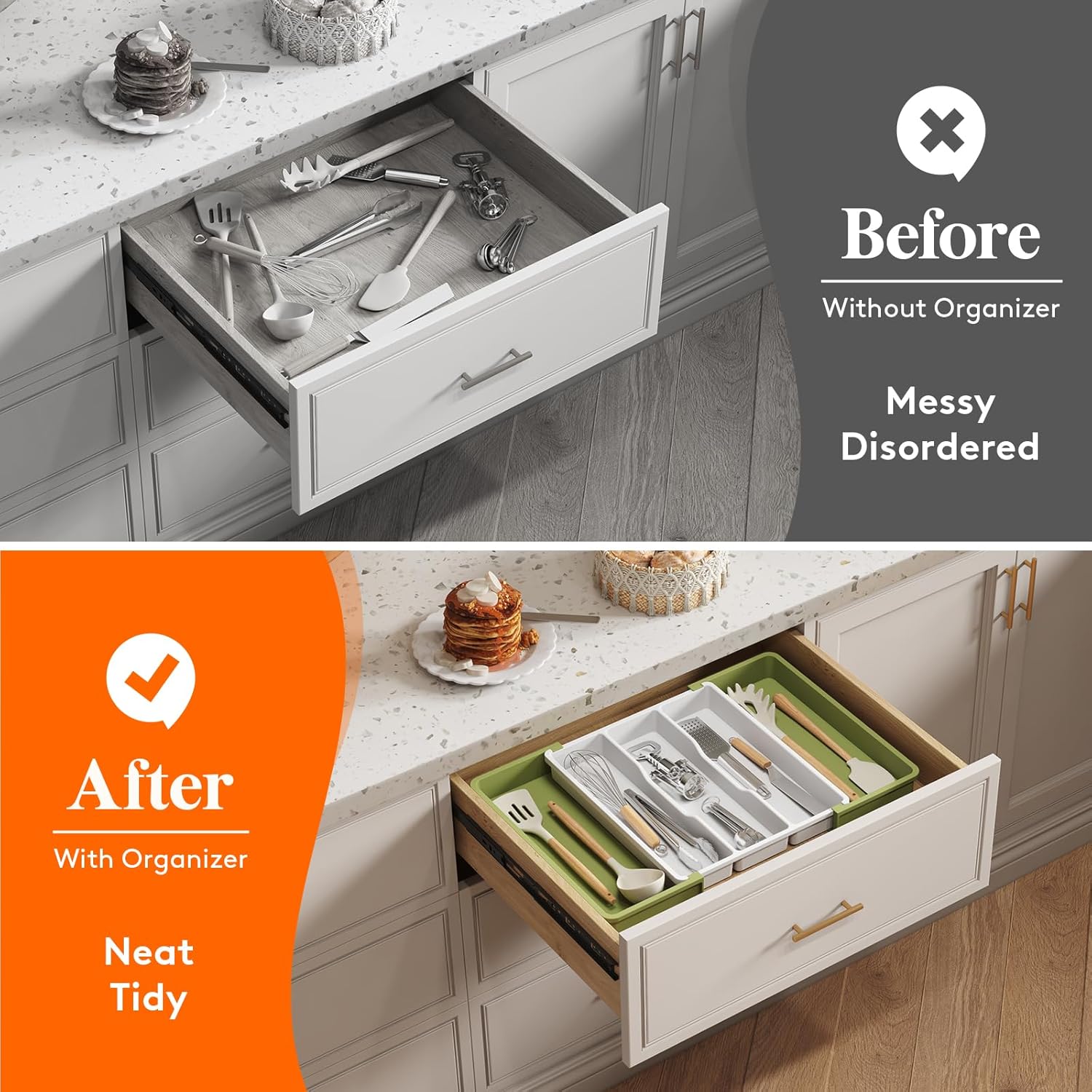 Lifewit Utensil Organizer for Kitchen Drawers, Expandable Cooking Utensil Tray, Adjustable Cutlery Silverware Flatware Holder, Plastic Spatula Tools and Gadgets Storage Divider, Large, Green&White