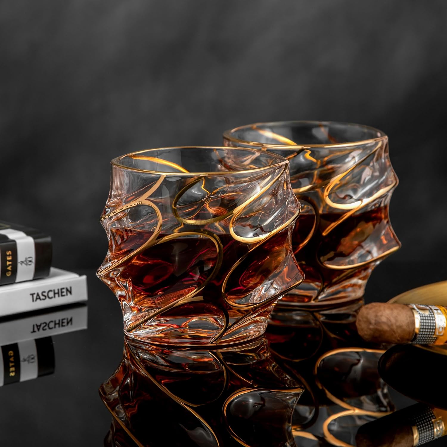 - Unique 24k Gold Plated: Look and feel luxurious. You are not going to find a more stylish old fashion whiskey glasses. Practical to Make an Impression on Guests with 2 Scotch glasses in unique luxury Style. Elegant, handcrafted barware glasses set comes coordinating double old-fashioned tumblers, allowing you to recreate your favourite movie scene. For all they know, you could be serving them your finest liquor! Create the ideal atmosphere at your home, workplace, man cave, James Bond hideaway, or bar.