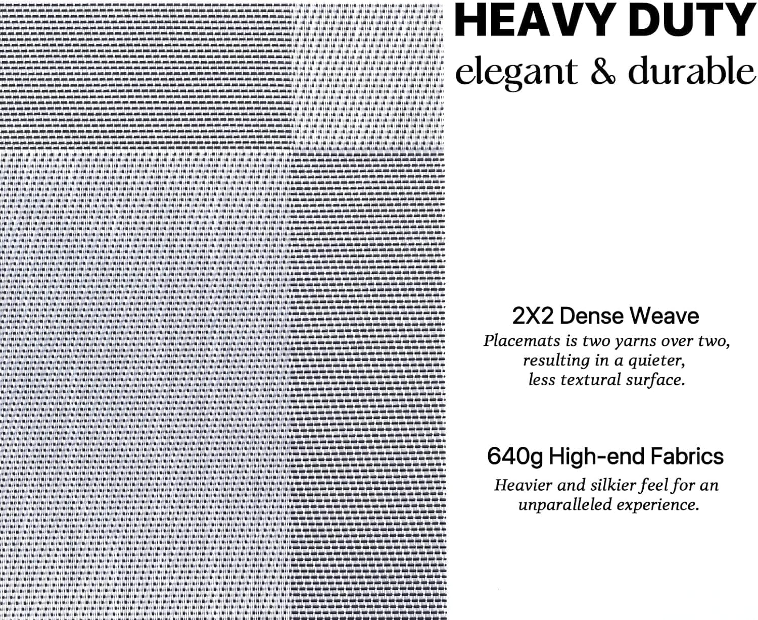 - HEAVY-DUTY:We uses the German-imported higher grammage vinyl material (Specialty PVC)than other placemats on the market,plus the precise,dense weave craftsmanship to give the woven placemats a thicker feel and make the place mats long-lasting.