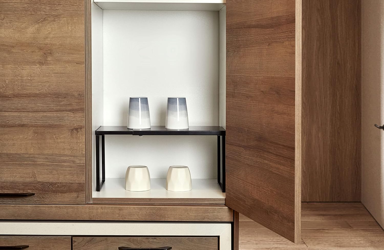 - FUNCTIONAL STORAGE: This cabinet shelf can be used in various scenes of your home including cabinets, pantry, cupboards, kitchens, bathrooms, bedrooms, under sink and any counter surfaces. You may use the shelf as a storage organizer for plates, cups, dishes, pots, bowls, snacks, books, magazines and whatsoever.