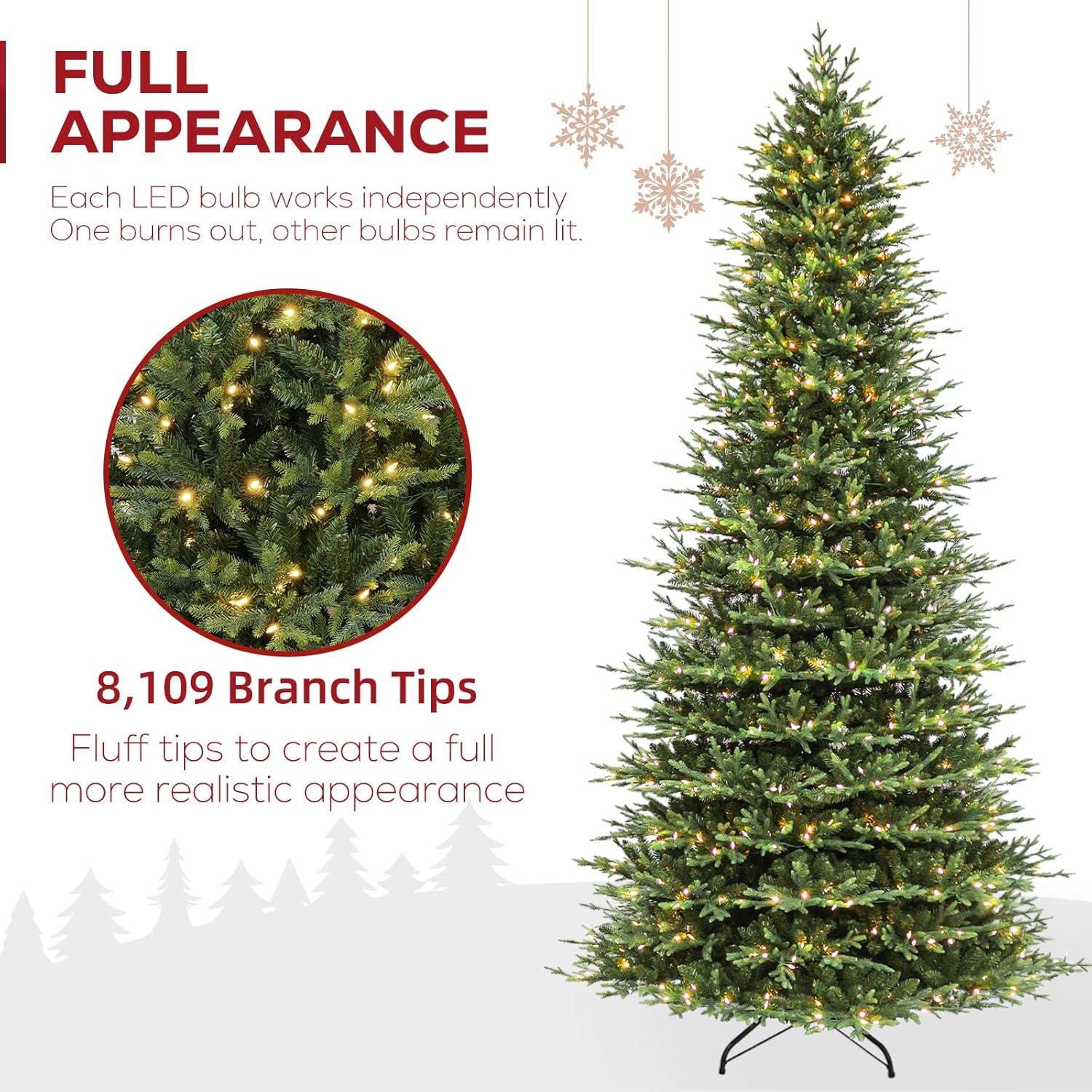 - PRE-LIT CONVENIENCE: The 12 ft Christmas tree comes pre-strung with 850 warm white LED lights, adding a fantastic festive atmosphere to your home. The UL certified bulbs are designed to stay lit even if one burns out, ensuring continuous illumination.