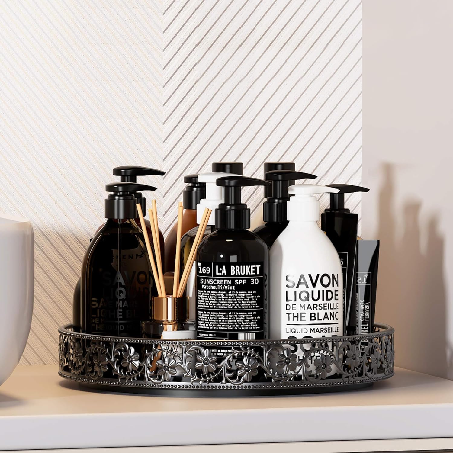 - 【Design with Floral Raised Edges and Open】The lazy susan for cabinet heightened edge with beautiful classic flower design not only provides exceptional decorative visual, but also prevents items from falling when rotating, it's safer to move the lazy susan organizer tray from one place to another.The open design of turntable organizer makes items clearly visible and easy to access and use.