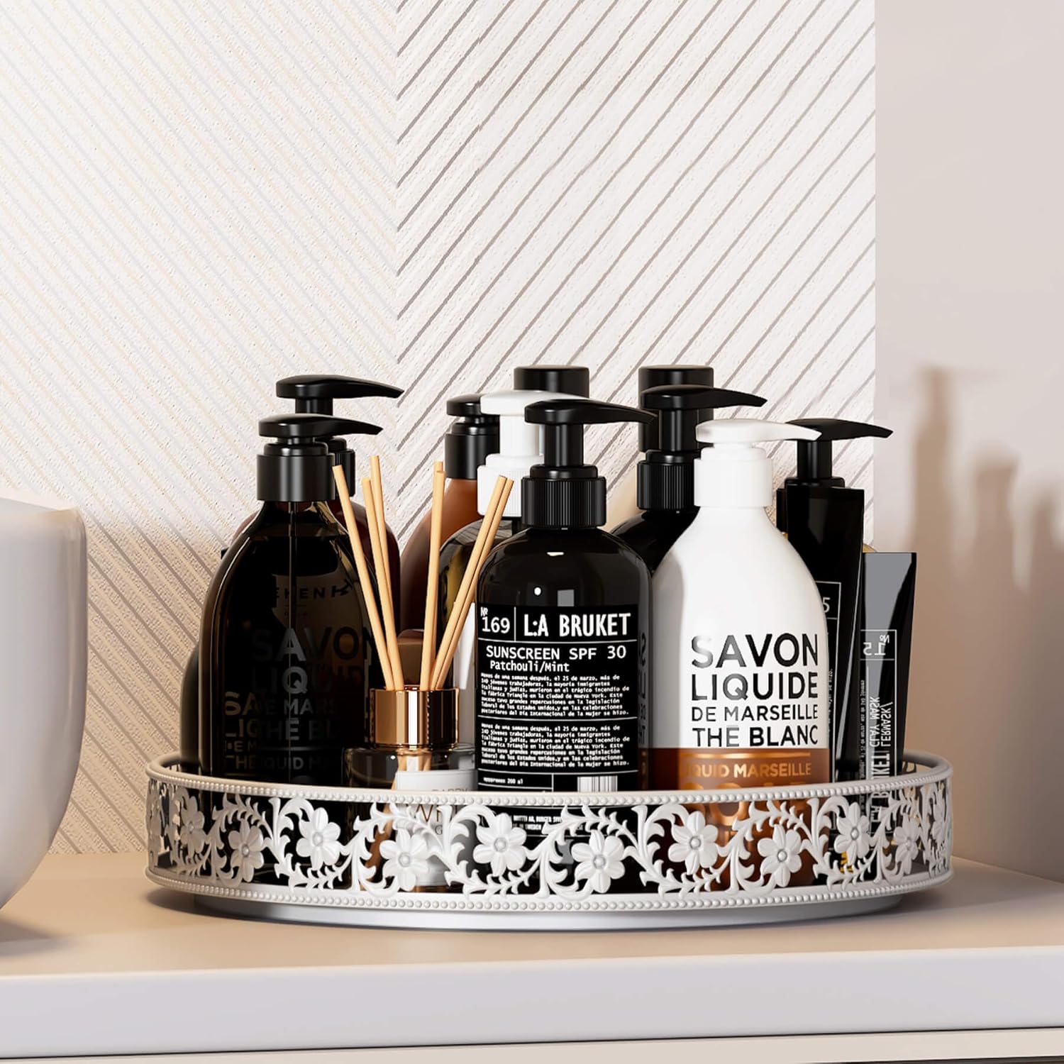 - 【Design with Floral Raised Edges and Open】The lazy susan for cabinet heightened edge with beautiful classic flower design not only provides exceptional decorative visual, but also prevents items from falling when rotating, it's safer to move the lazy susan organizer tray from one place to another.The open design of turntable organizer makes items clearly visible and easy to access and use.