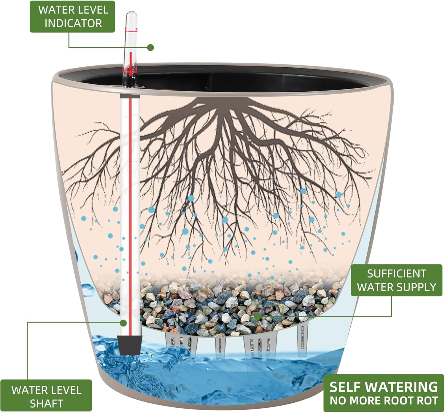 Dexceder 13x12 Self Watering Planter with Wheels Indoor Outdoor, Inner Pot Design, Thickened Large Floor Standing Flower Plant Pot with Water Level Indicator (Taupe Matte)
