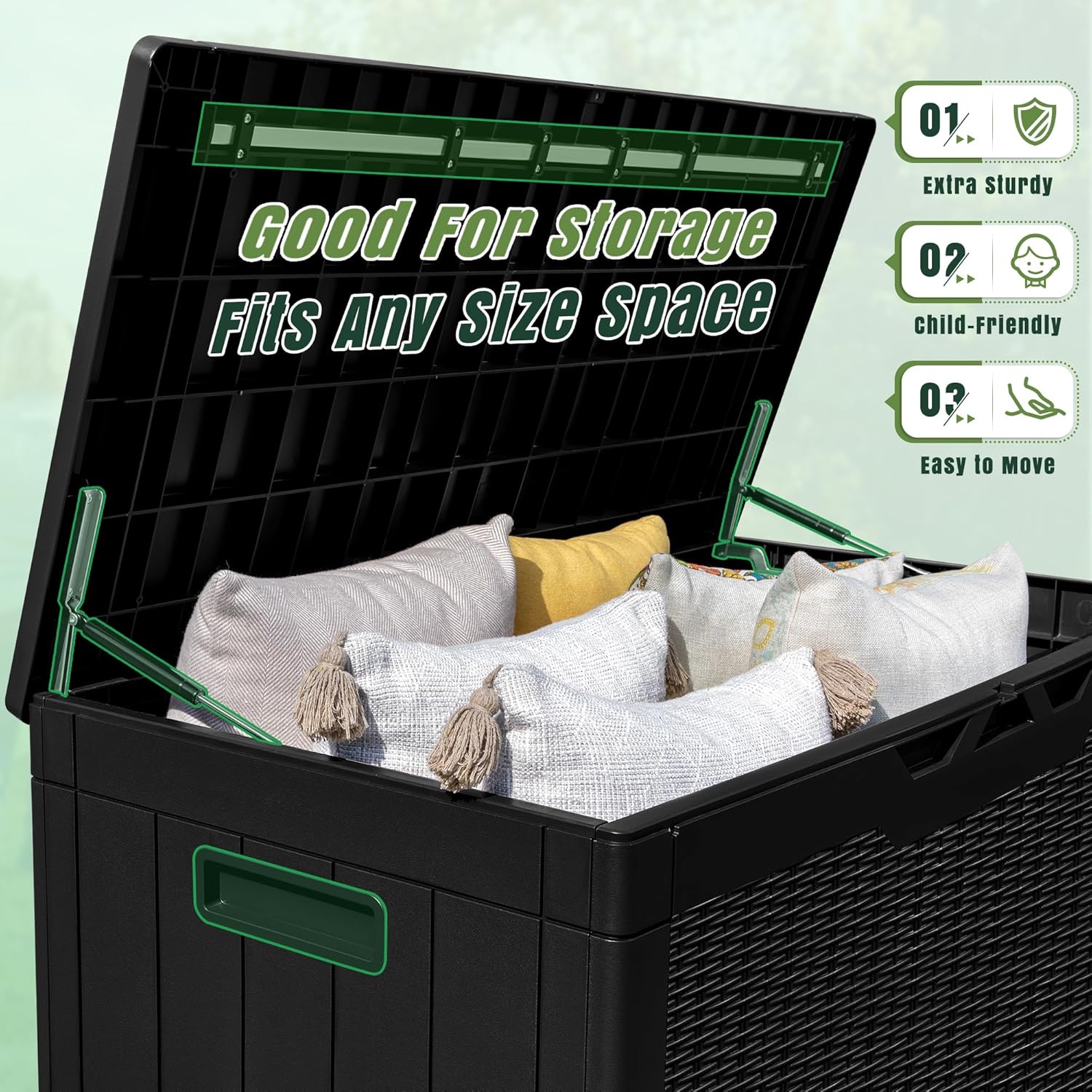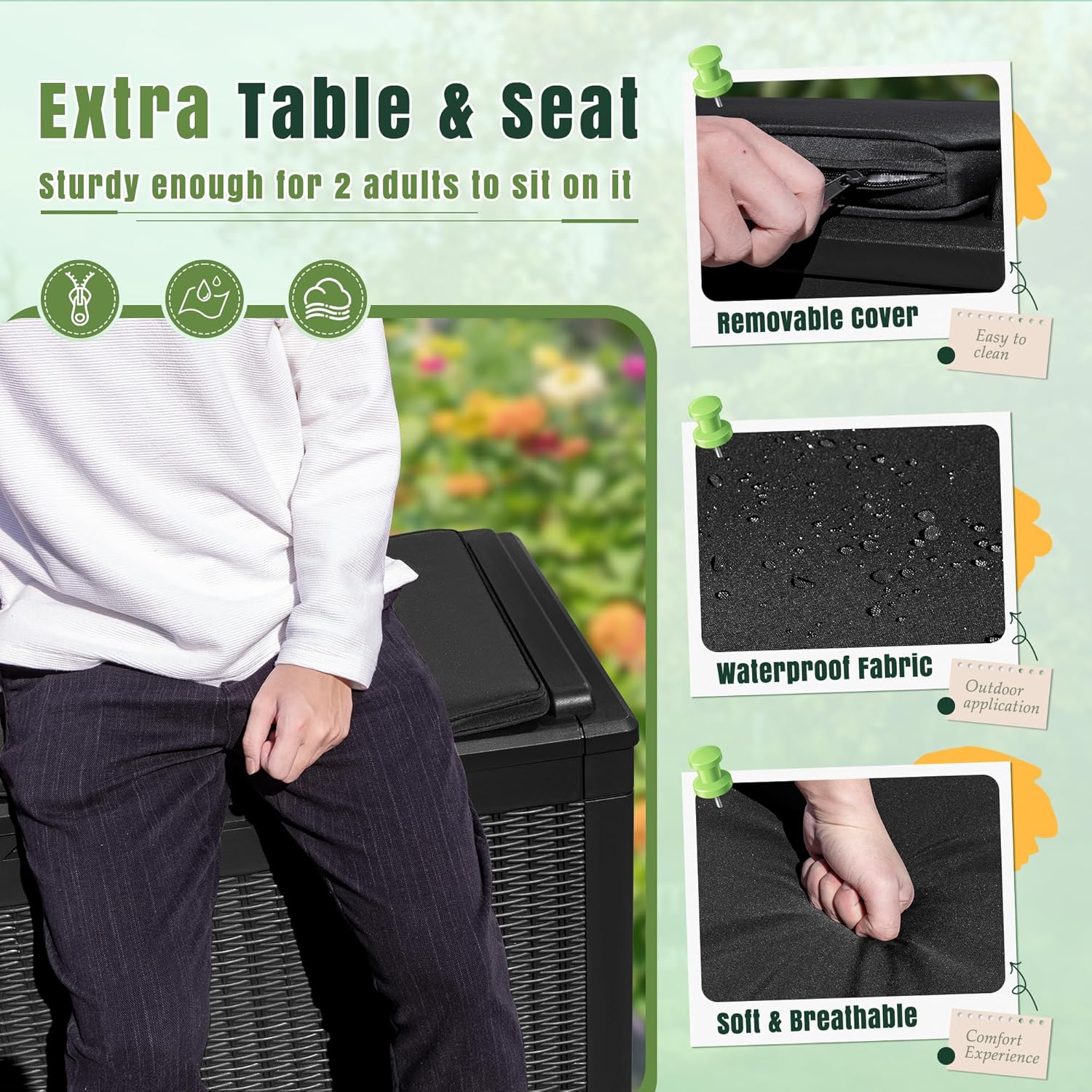 - EXTRA CUSHION:Besides helping you to organize your space, the deck box is equipped with a removable thick cushion, you can also use it as a stool to ensure your safety when opening and closing the box.