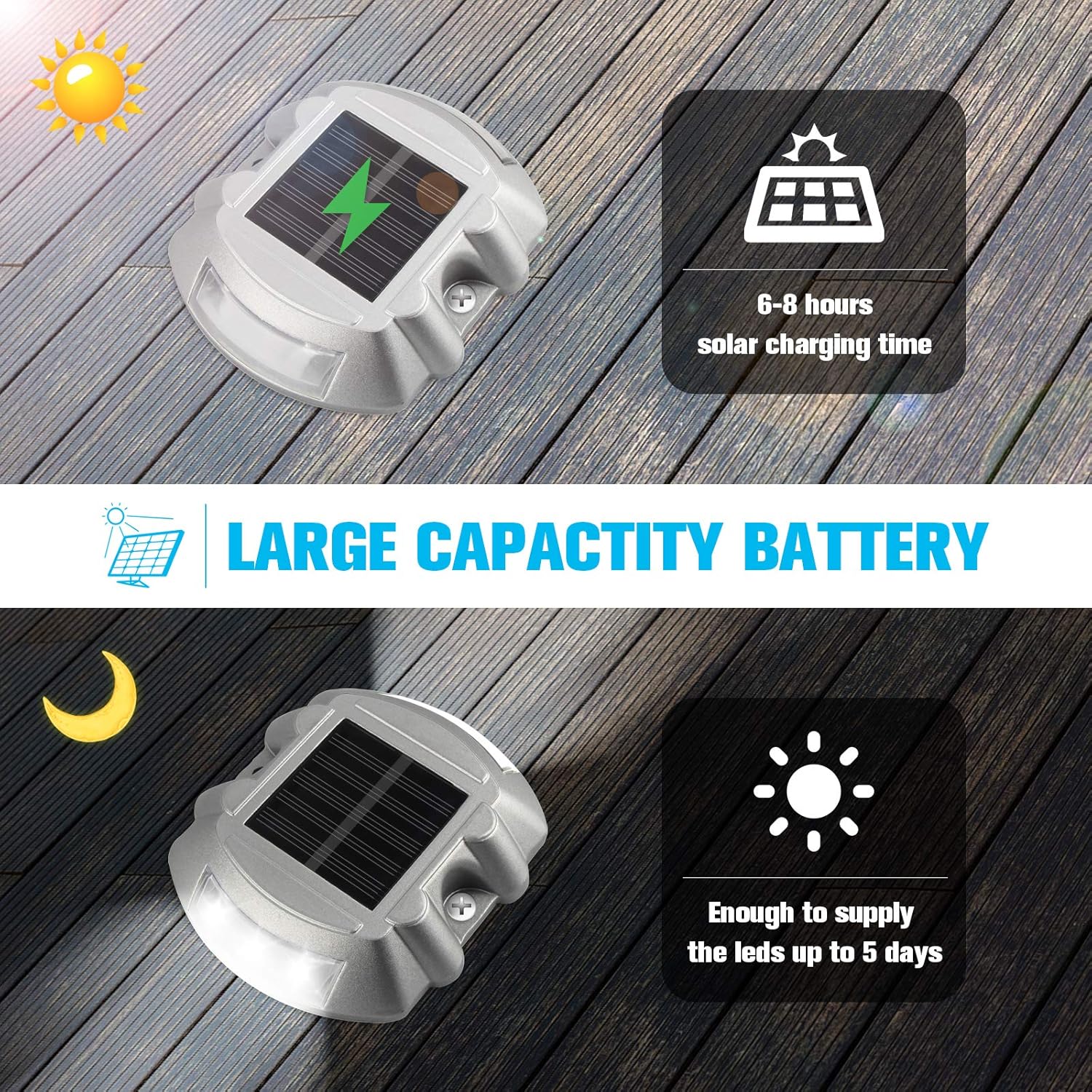 - 【Solar Powered】Eco-Friendly Rechargeable solar panels,automatically recharges during the day and glows when night falls.Each light has 6 leds which gives out Intensityt and steady light.we could have called these Deck Dots, Stair Dots, Pier Dots or Boardwalk Dots