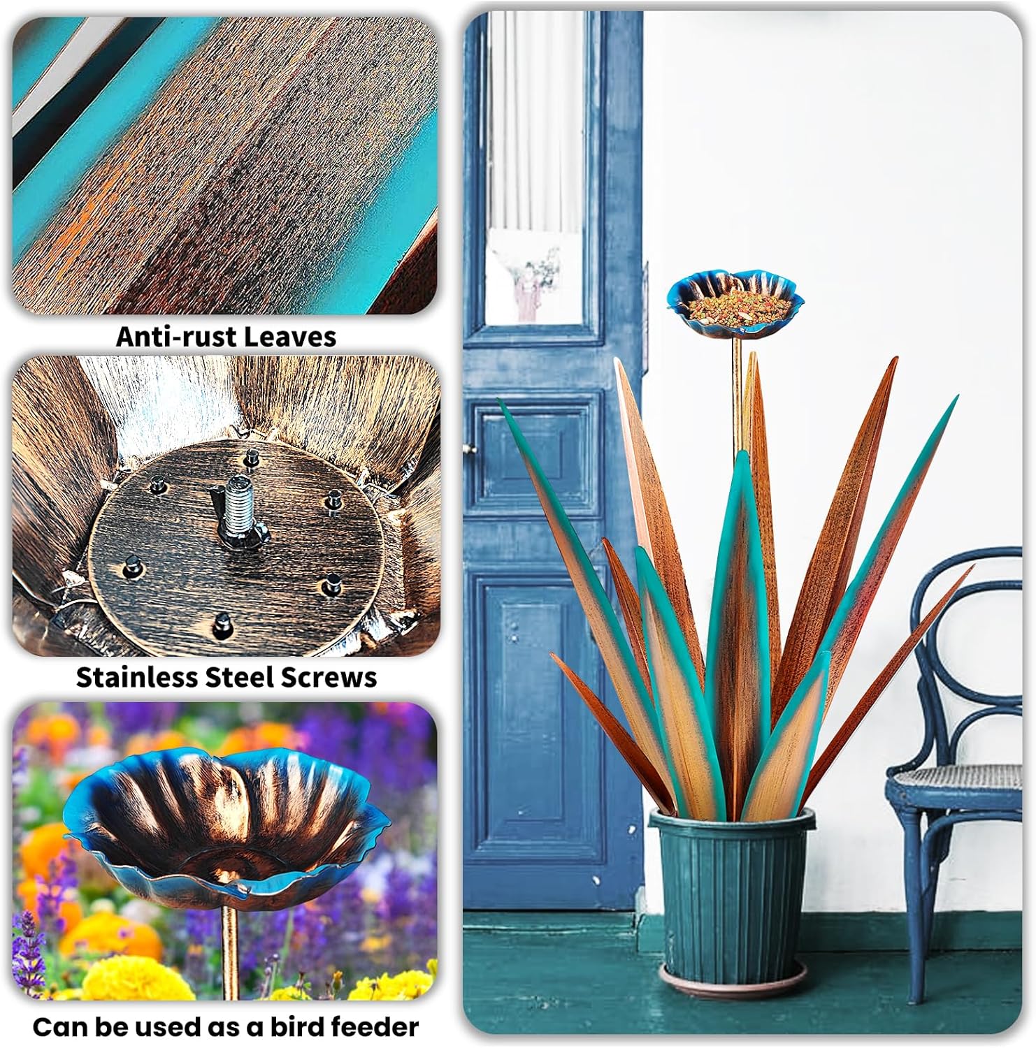 Large Tequila Rustic Sculpture, Rustic Metal Agave Plants for Outdoor, Home Decor Garden Yard Statue (Blue - L (W/Bird Feeder))