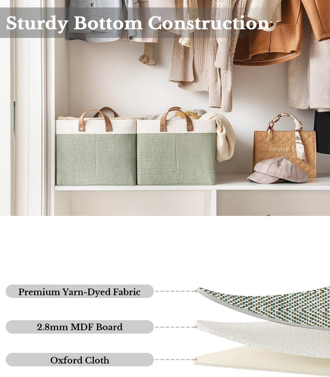 - Premium Quality: Made from high-quality fabric and reinforced with a heavy-duty MDF bottom board and a sturdy metal frame. The solid construction enables the storage bins to stand upright without support, even when empty.