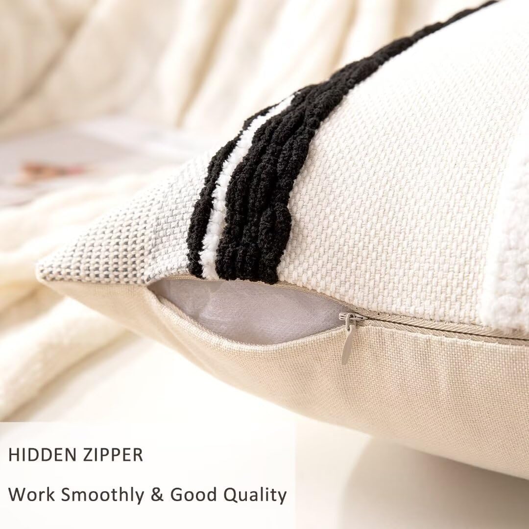 - Fabric: The stripe pillow case is made up of chenille and tufted on the front, and premium linen fabric on the back. Different styles on both sides offer you multiple decorative ideas. Sturdy stitching and careful hemming make the black white accent pillow covers durable and exquisite. The zipper pulls up smoothly and is not easy to break