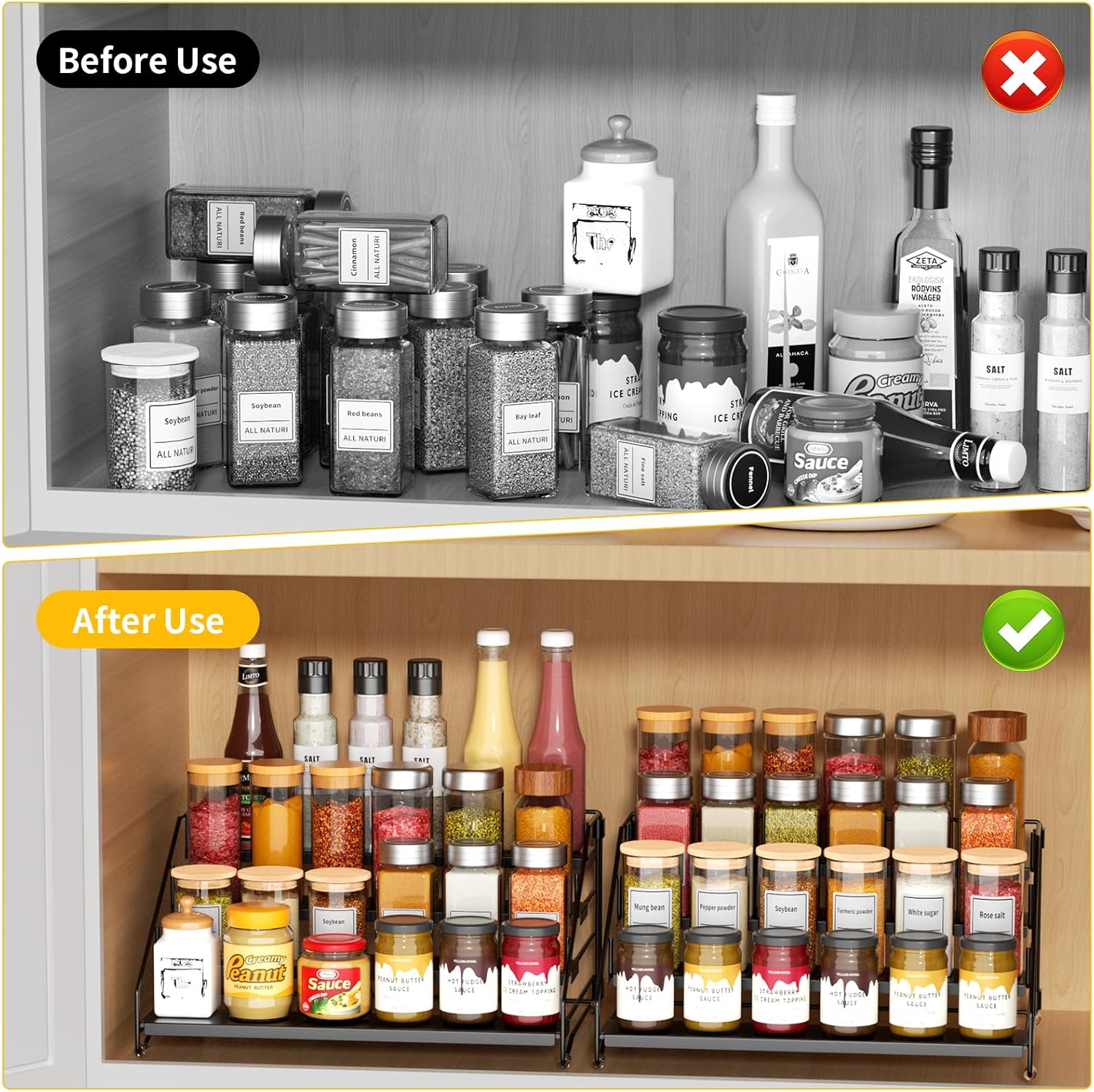 - 【Durable Metal,Strong And Sturdy】:The seasoning organizer rack made of high quality metal,sturdy frame and each tier has a sheet metal base design, provides spice bottles more stable to place and less to tip over. The surface of this cabinet organizer is smooth,with an anti-rust coating, and easy to clean with water or rag.