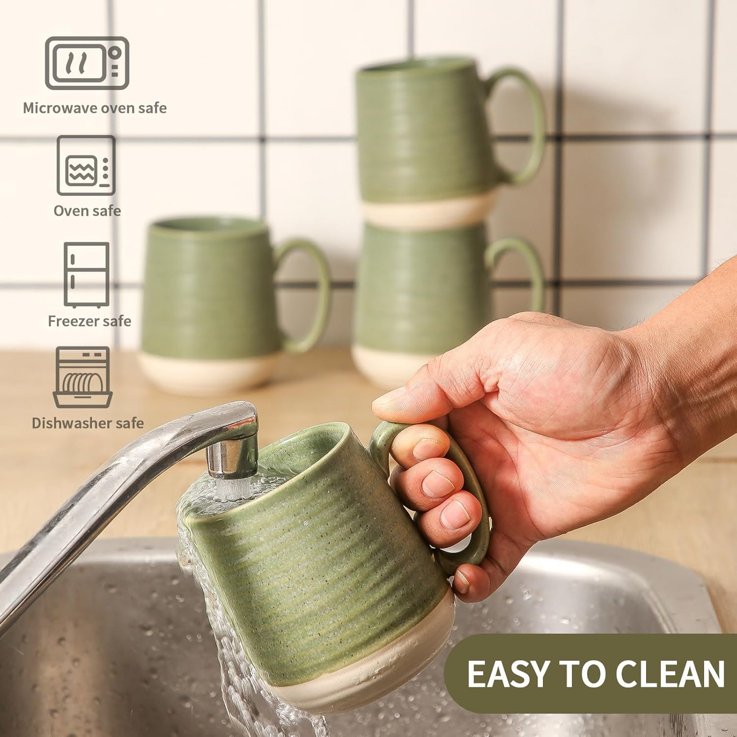 - FUNCTIONAL AND PRACTICAL: The green mugs measure 4.7*3.1*4.1inch which is large and deep to hold any of your favorite beverage. With a capacity of 15 oz, these mugs set are perfect size to hold coffee, tea, milk, cocoa, cappuccino and hot chocolate. Suitable for home, office, party and holiday.