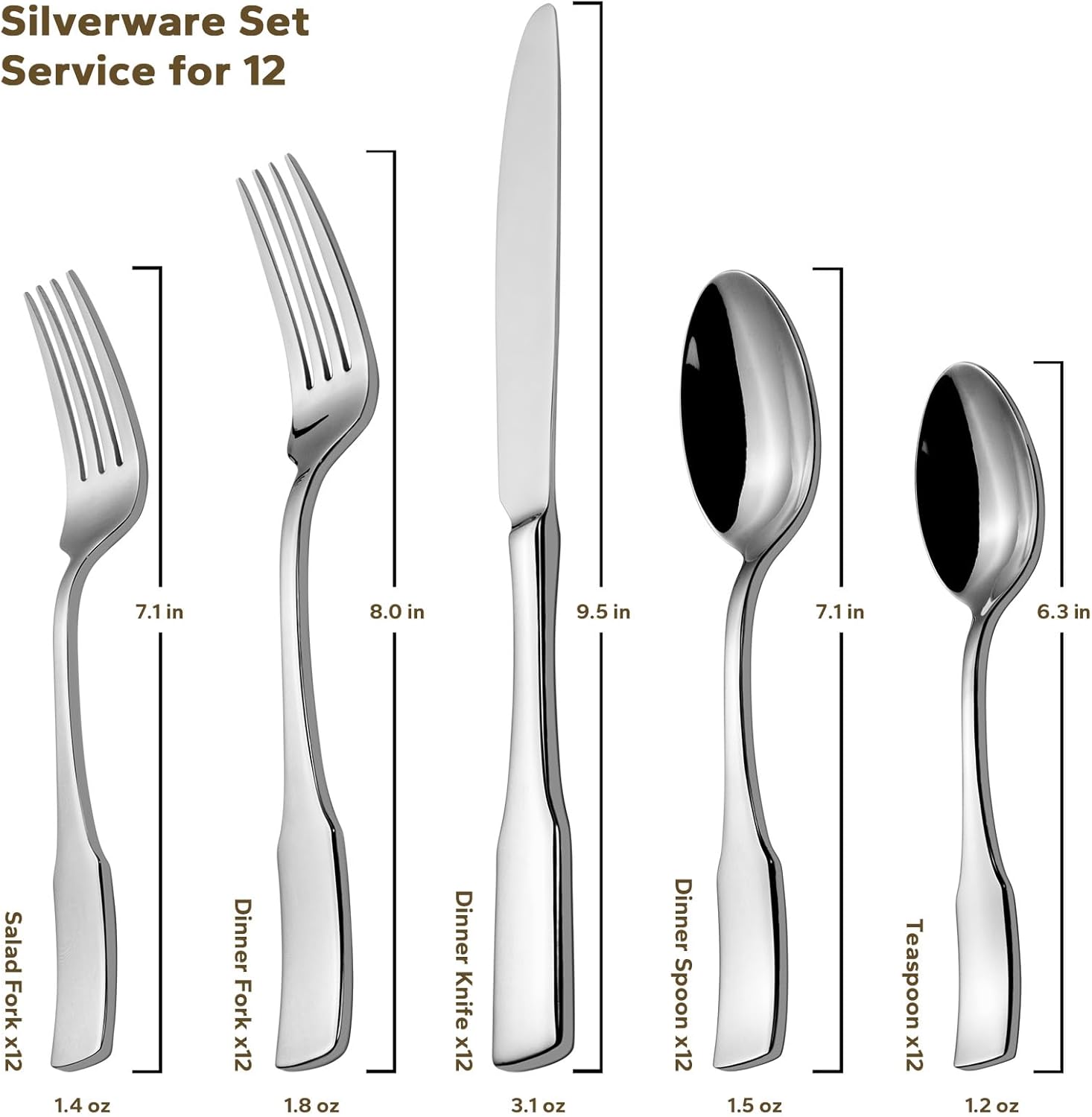 - INCLUDES: 65-piece flatware set with service for 12. Includes 12 each: dinner knife, dinner fork, salad fork, dinner spoon and teaspoon. Plus 1 each:serving tablespoon, pierced tablespoon, cold meat fork, butter knife, and sugar spoon