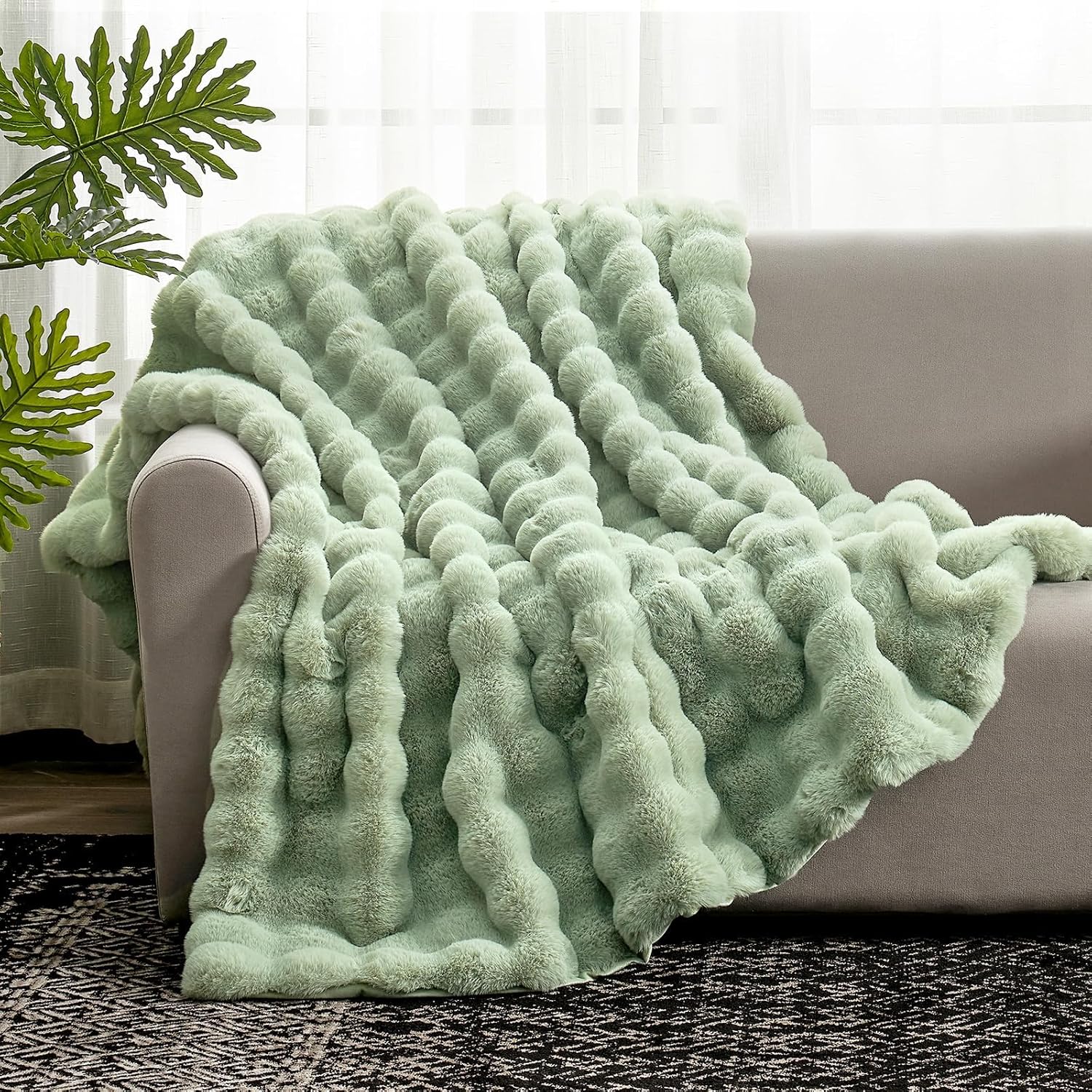 Cozy Bliss Faux Fur Throw Blanket for Couch, Fuzzy Soft Plush Thick Bubble Blanket for Sofa Bedroom Living Room, 60 * 80 Inches Sage Green