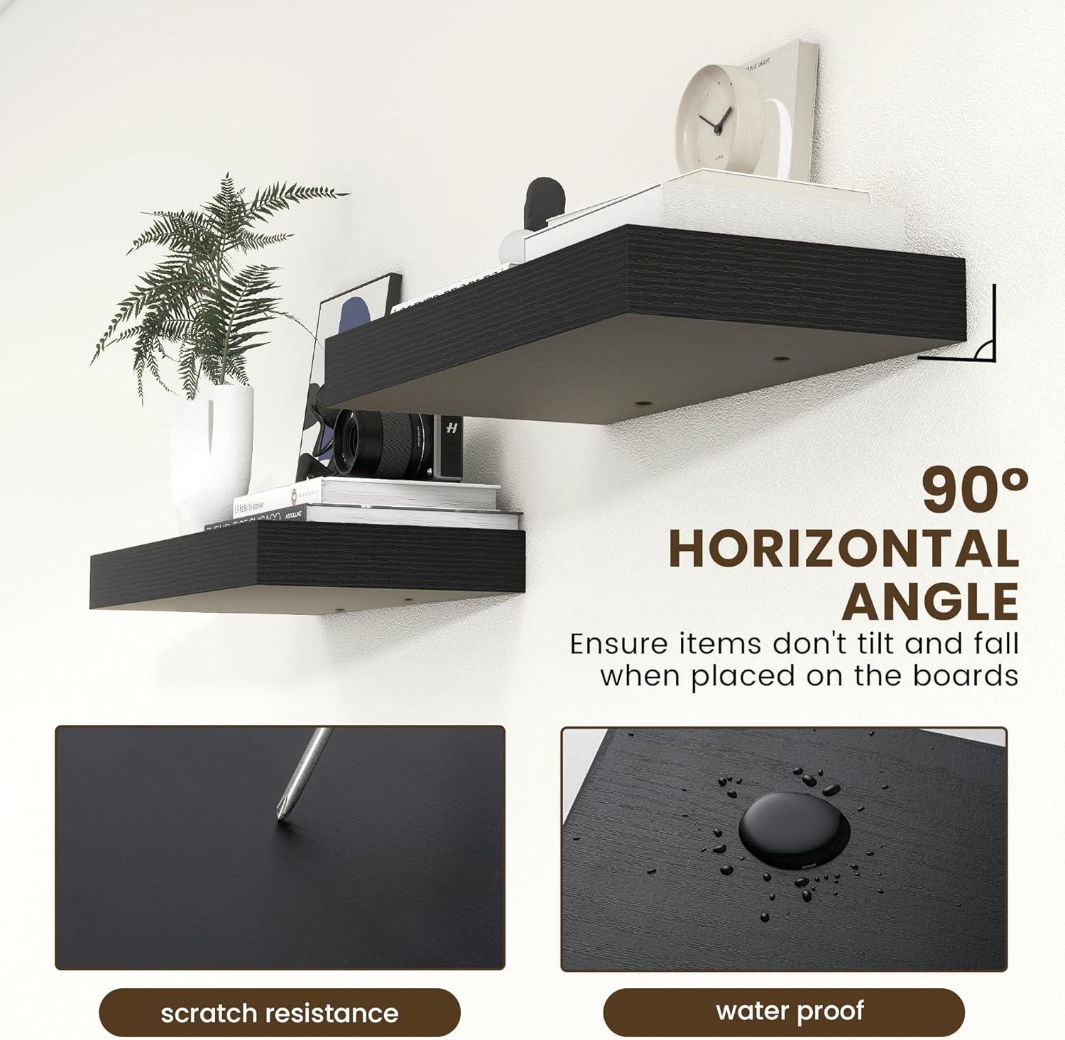 - EASY TO INSTALL - Come with all the installation hardware you need. We have a smart installation design. Thicken metal brackets help boards to be stable and load-bearing, vertical to the wall, and not sagging. The shelves have pre-drilled holes in the bottom to allow screws to secure the boards to the brackets to prevent them from slipping.