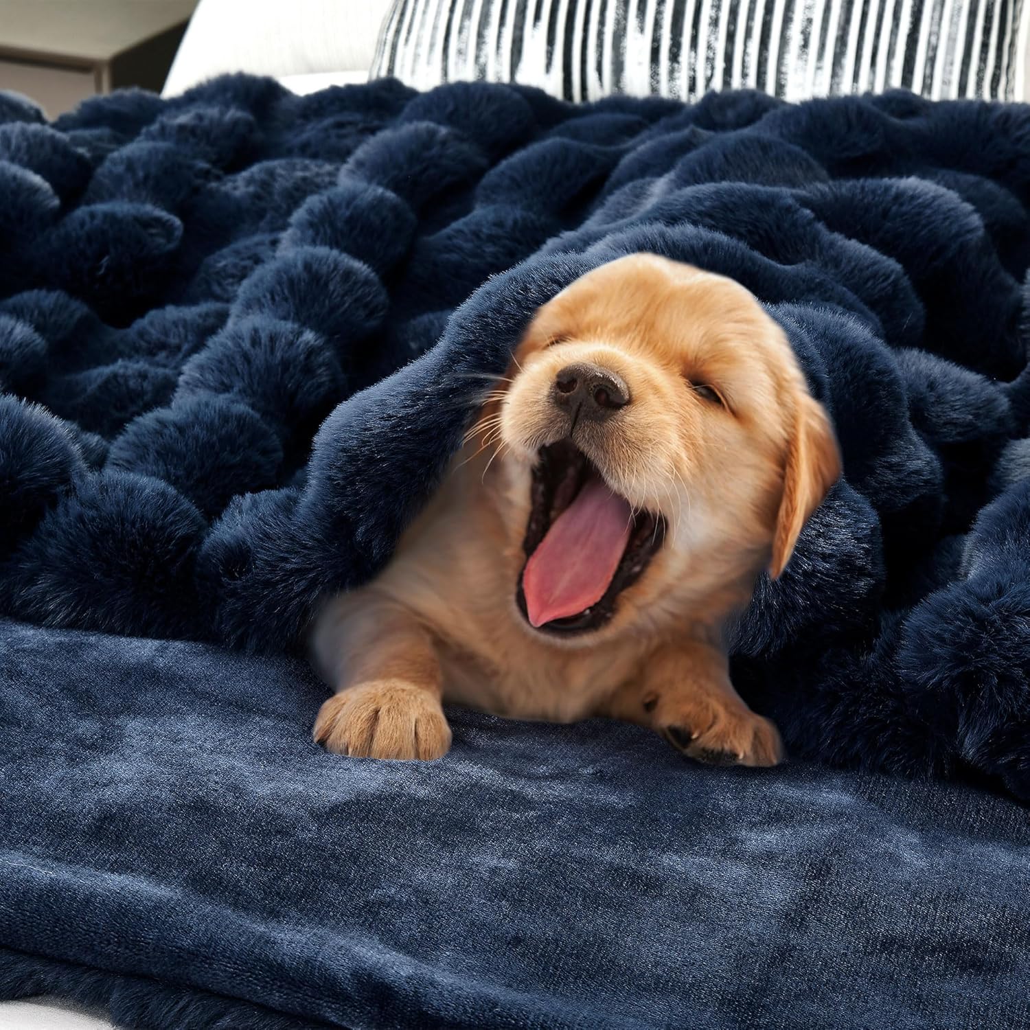 DREAMNINE Oversized Soft Thick Fuzzy Bubble Faux Rabbit Fur Throw Blanket Twin Size 60" x 71", Double Sided Comfy Plush Warm Shaggy Fluffy Blankets, Luxury Cozy Cute Furry Blanket for Bed, Navy Blue