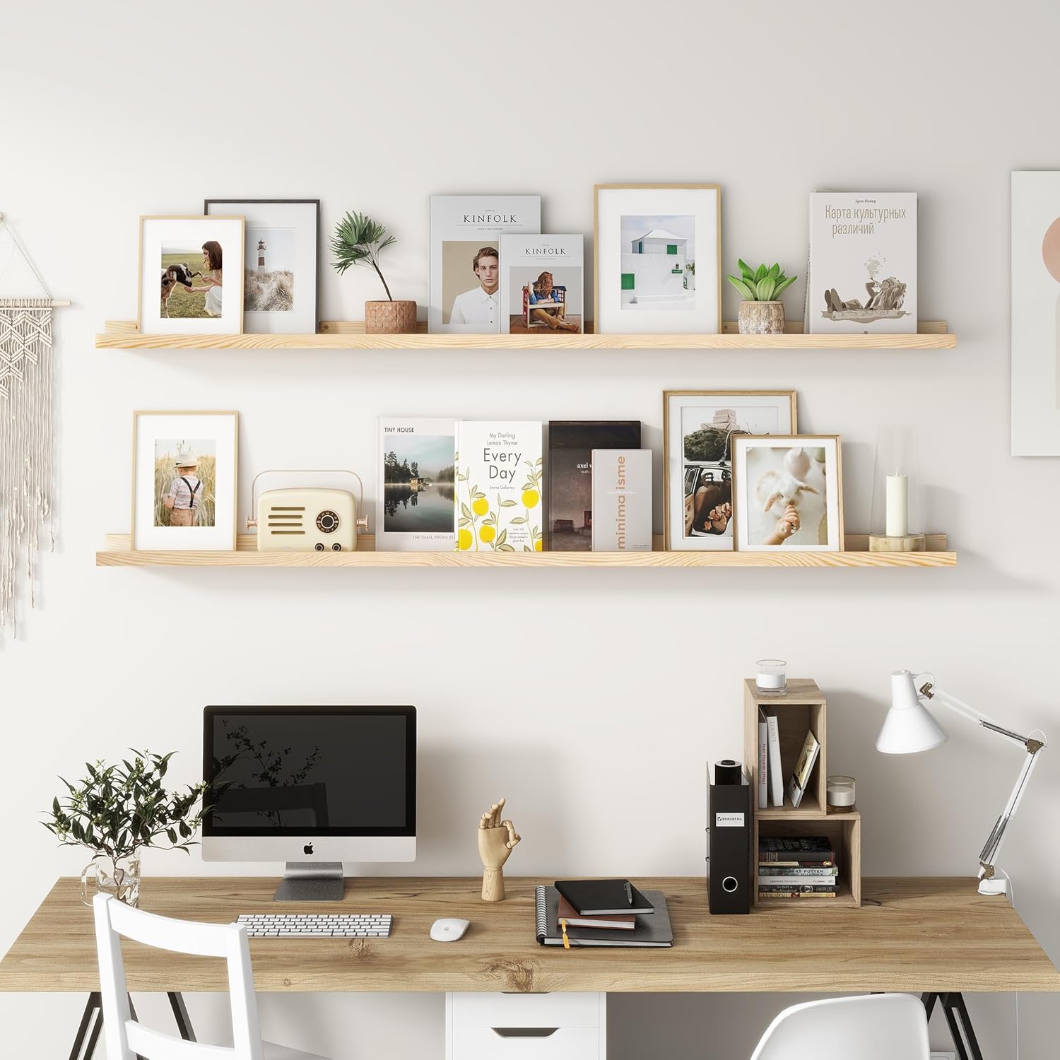 - Easy to Install: You will get a level, screws for the wall, drywall anchors, a detailed installation guide, and two beautiful hand-crafted solid pine wood shelves. With the level, you can make sure your picture ledge shelves are well aligned. Just follow the simple instruction to install the hanging shelves for wall decor within 10 minutes. We add additional screw and anchor to the hardware bag just in case. If you have any questions about our products, please feel free to contact us