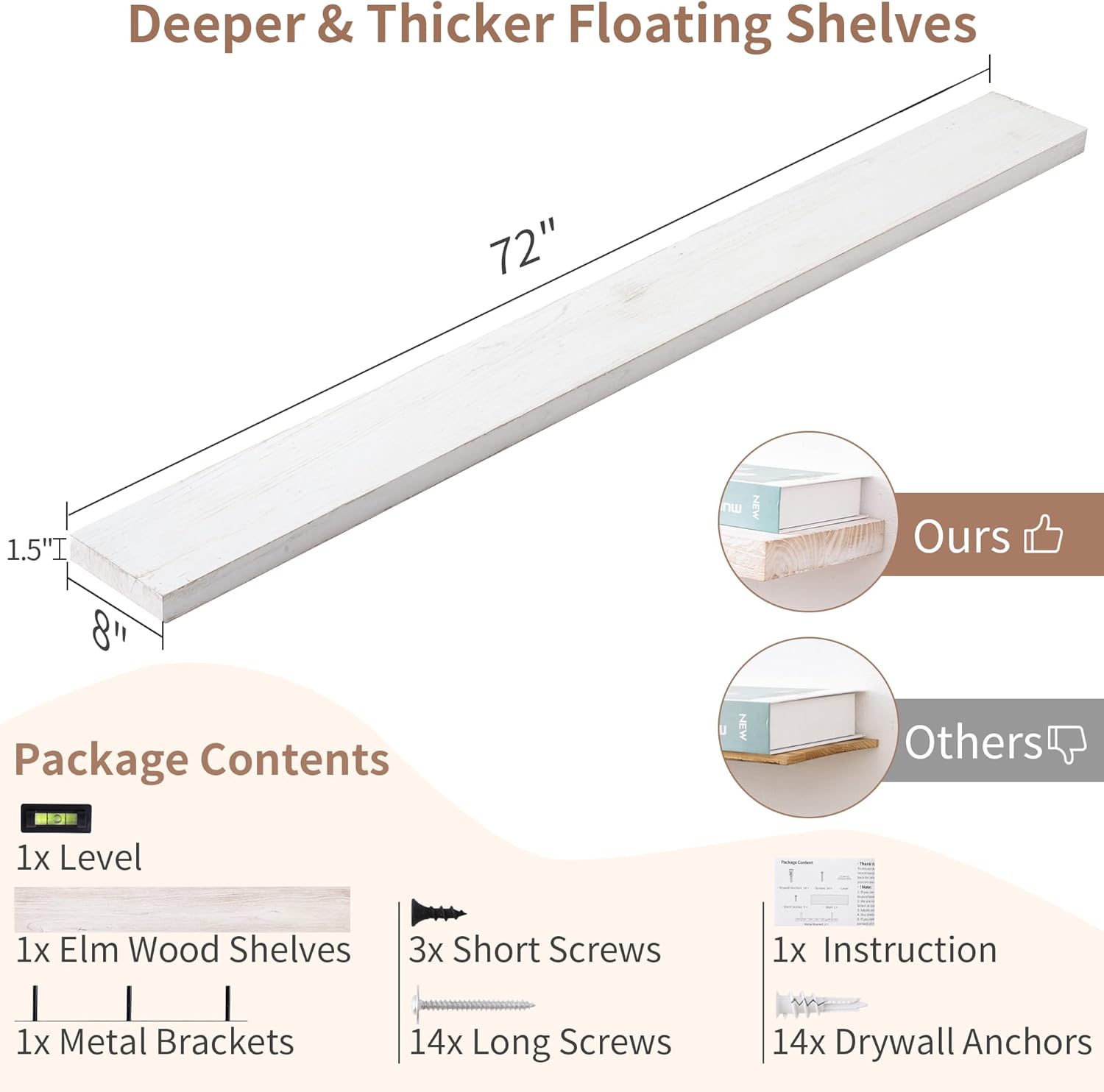 - 8" DEEP-MORE SPACE MORE TIDINESS: Axeman 72 inch floating shelves are designed to be deeper and thicker than traditional floating shelves, with a thickness of 1.37 inches and a depth of 8 inches. You can display a variety of items, such as photos, books, and knickknacks on these sturdy and spacious natural wood floating shelves