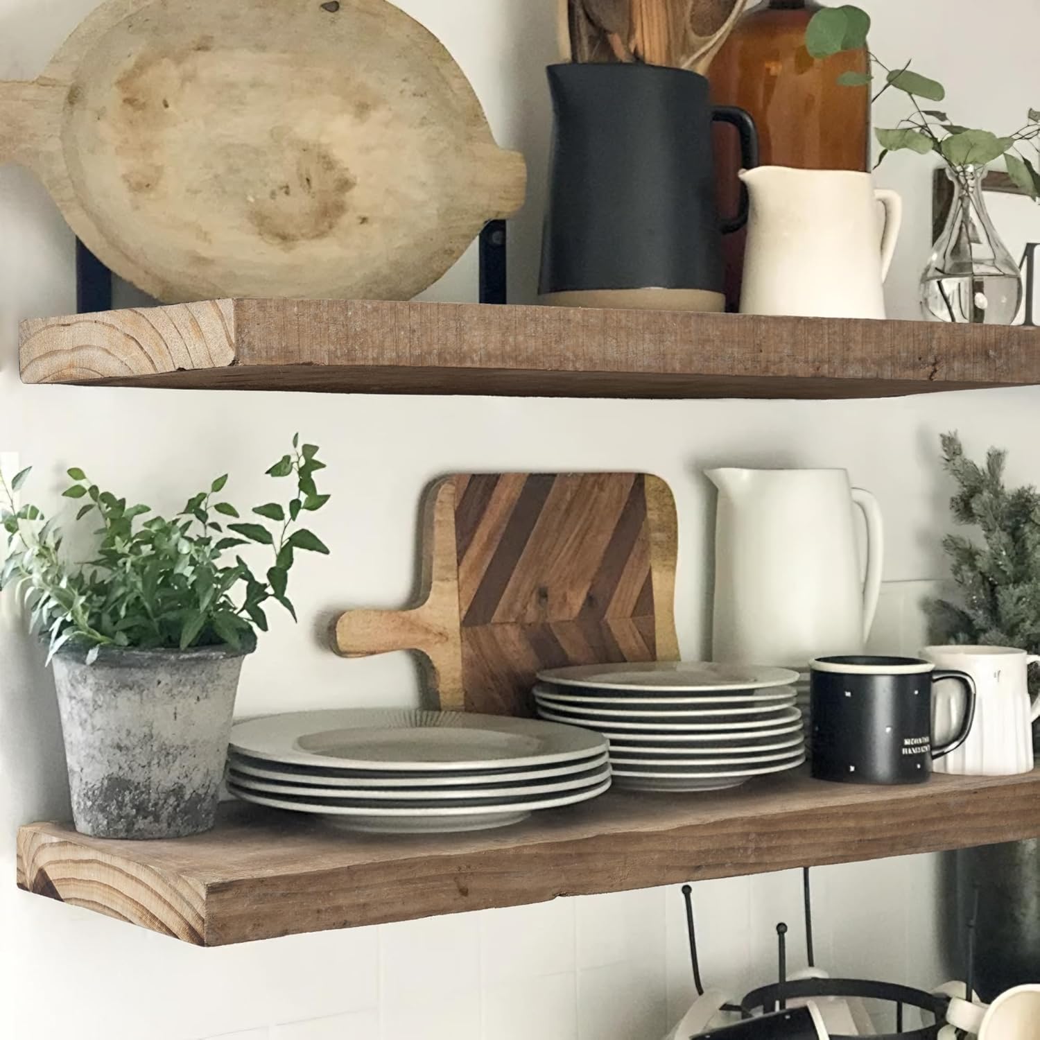 - Sturdy & Sleek Mounting - Our floating shelves feature heavy-duty brackets that install seamlessly into wall studs, providing up to 30lb of weight capacity per shelf. The flush mount design hides the brackets for a clean, rustic farmhouse style look, while screws at the bottom keep wall shelves securely in place.