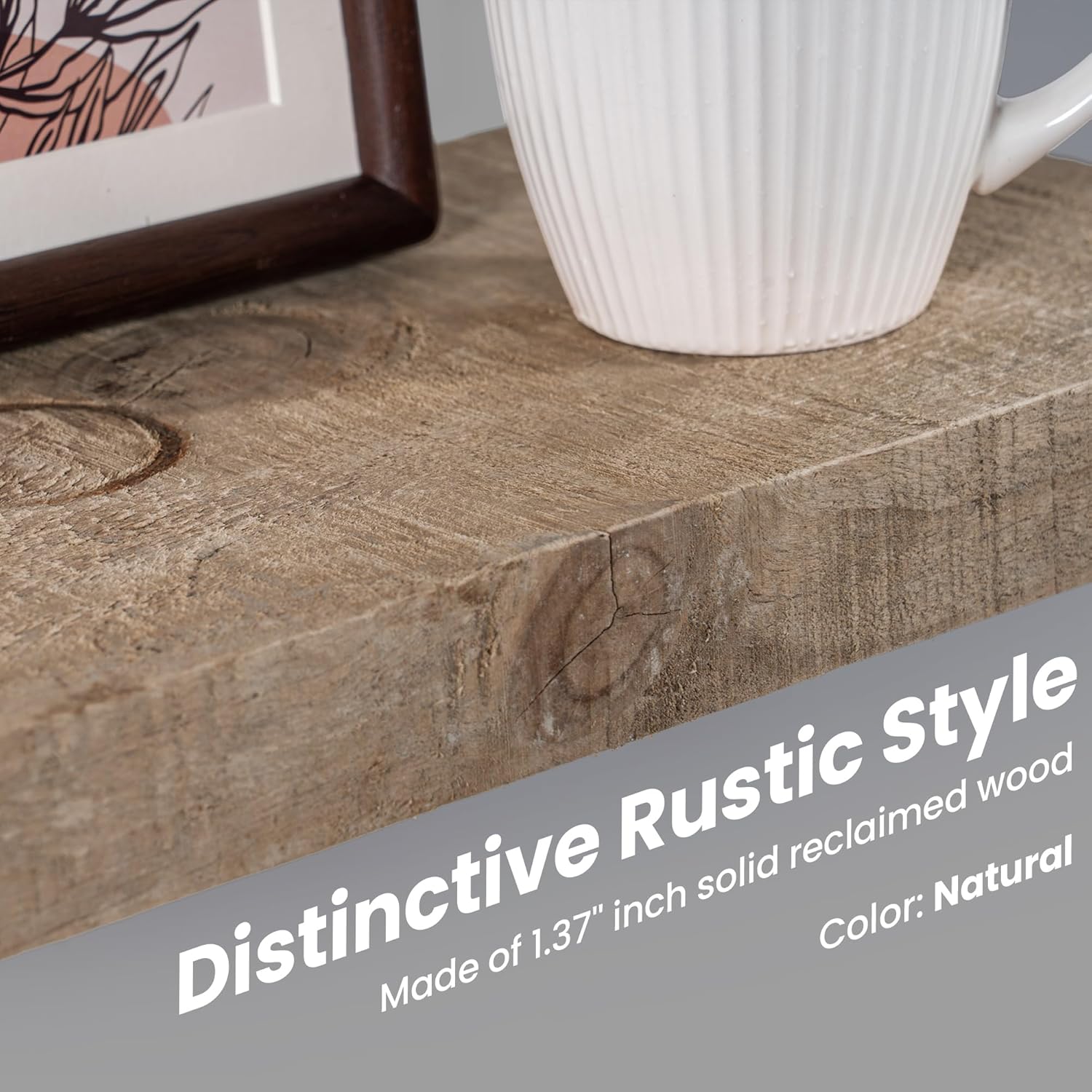 - Authentic Reclaimed Wood -- Our hanging shelves are beautifully crafted from solid reclaimed barnwood with natural markings(nail holes, screw holes, discoloration, scratches, dents, and many other variations), making each piece a unique work of art. These marks reveal the wood's rich history and bring character to your home decor. We do not alter these natural variations, but ensure safety by removing any excess nails and burrs. No two pieces are alike.