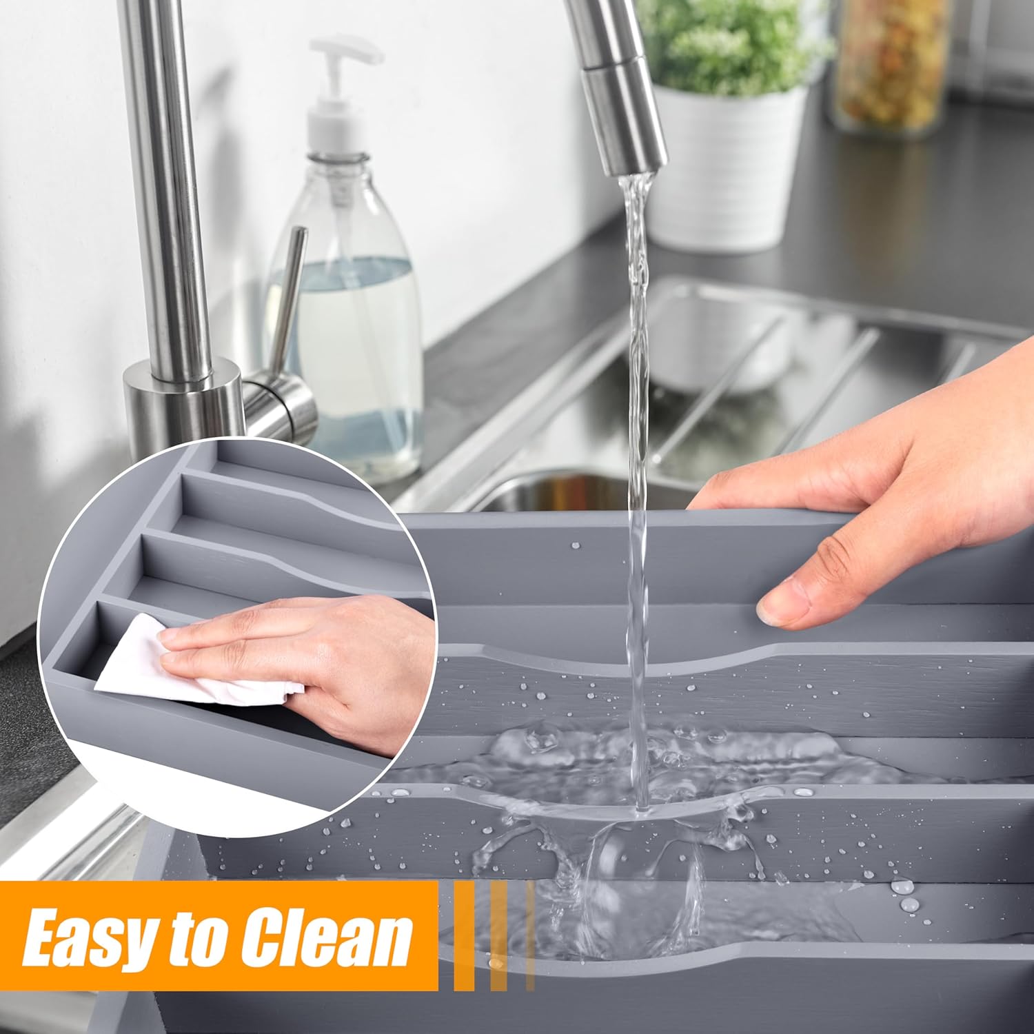 - ✅【Deep Compartments & Reinforced Base】Our utensil drawer organizer features compartments with a depth of 1.9 inches, helping maximize drawer space and perfect for storing more essential tools and gadgets. The utensil silverware drawer organizer flatware cutlery tray comes with a reinforced base, ensuring durability for long-term use, and is ideal for supporting the weight of heavy-duty utensils and knives. Keep everything you need conveniently at hand while cooking, neatly visible, and easy to grasp when preparing the next meal in the kitchen.