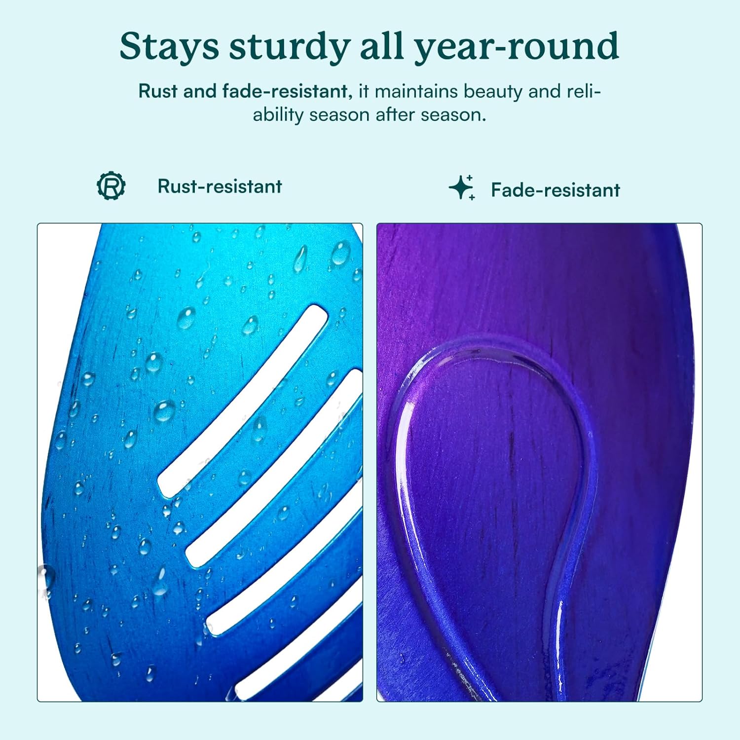- Yard Art: The eye-catching peacock blue wind spinners perfectly complements your backyard landscape, creating a harmonious ambiance. The double rotating windmill provides a soothing experience, helping you unwind and alleviate the fatigue accumulated throughout the day