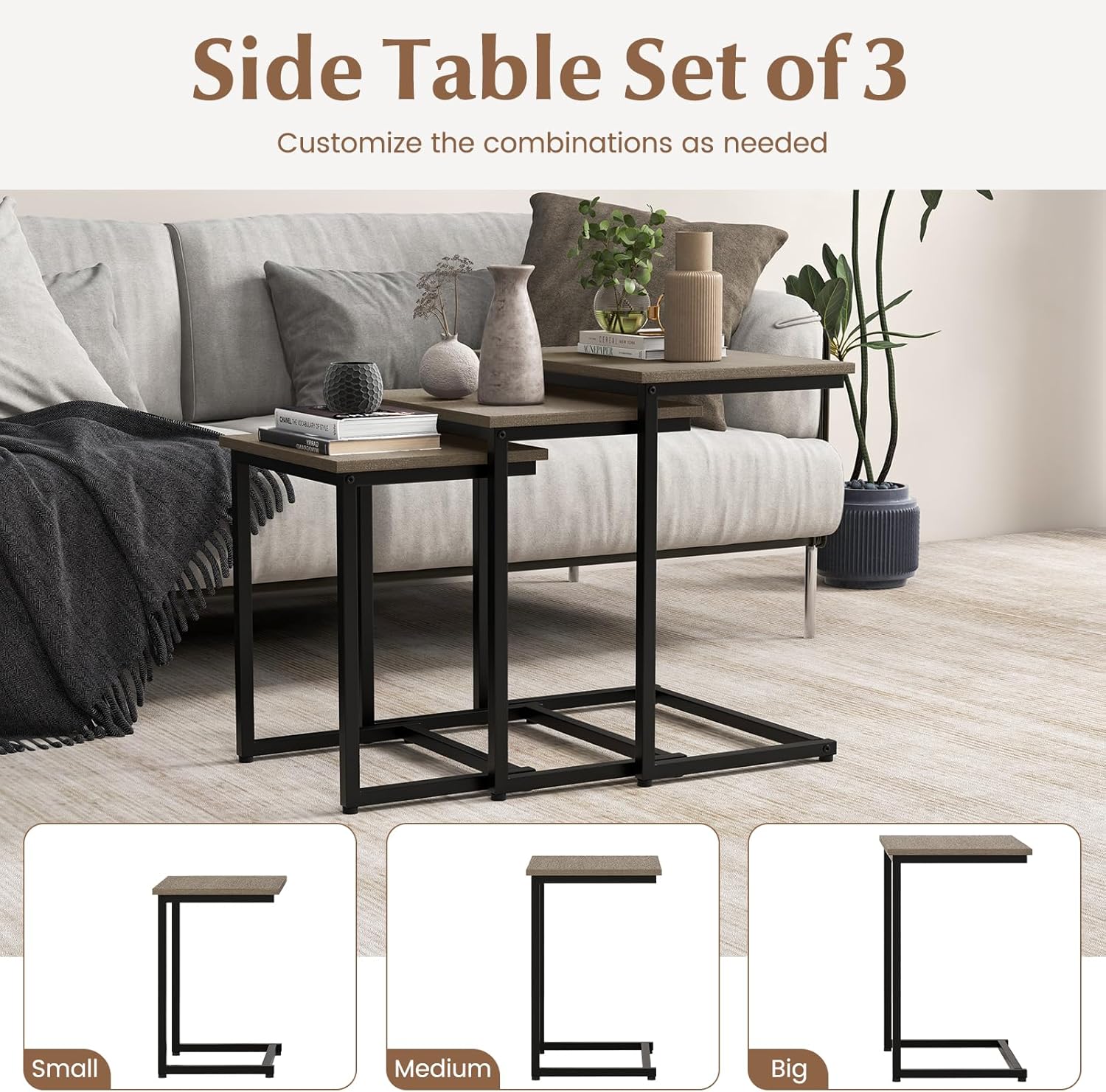 Giantex Nesting Coffee Table Set of 3, Stackable Square End Table w/Wood Grain Tabletop & Heavy-Duty Metal Frame, Farmhouse C-Shaped Accent Table for Small Space, Living Room, Bedroom (Black Oak)