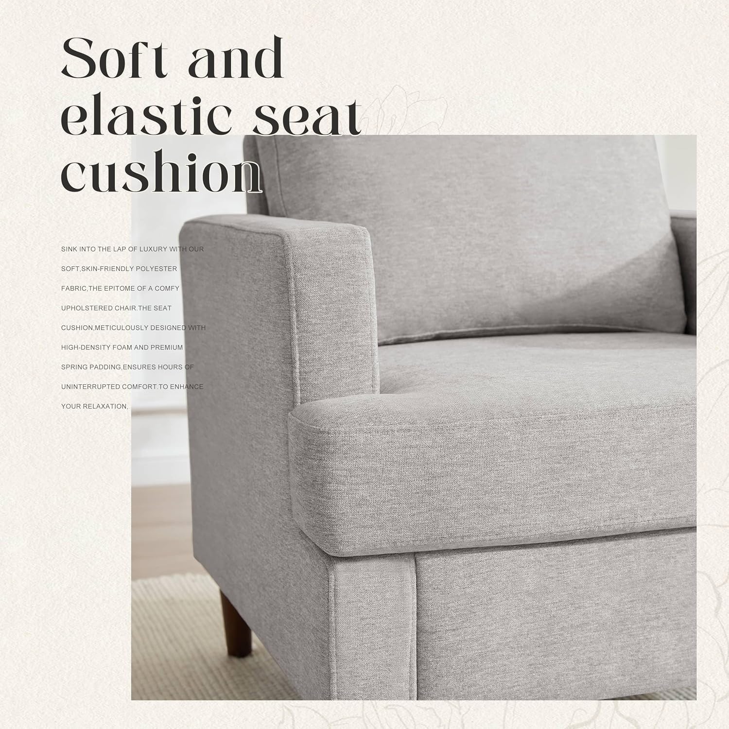- Support: The seat cushion,meticulously designed with high-density foam and premium spring padding,ensures hours of uninterrupted comfort; The perfect comfy accent chair for your space
