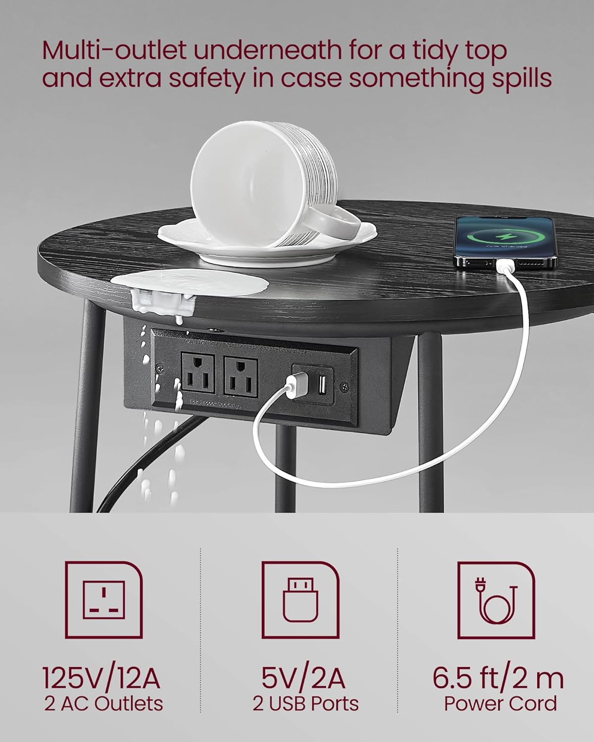 - [Built-in Charging Station] This side table is equipped with 2 AC outlets and 2 USB ports under the top, allowing you to charge your lamp, phone, tablet, and other devices conveniently without having to search for outlets
