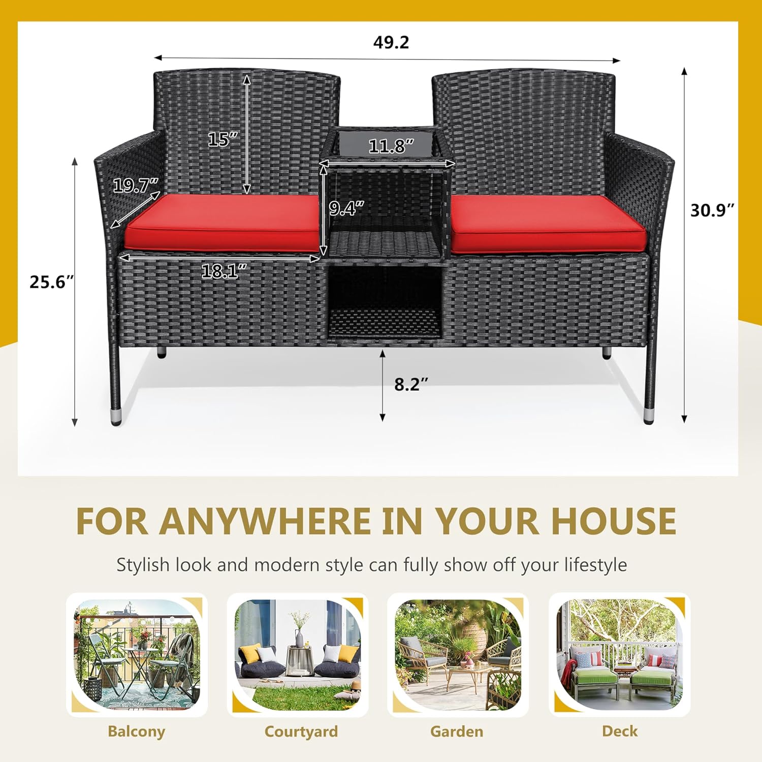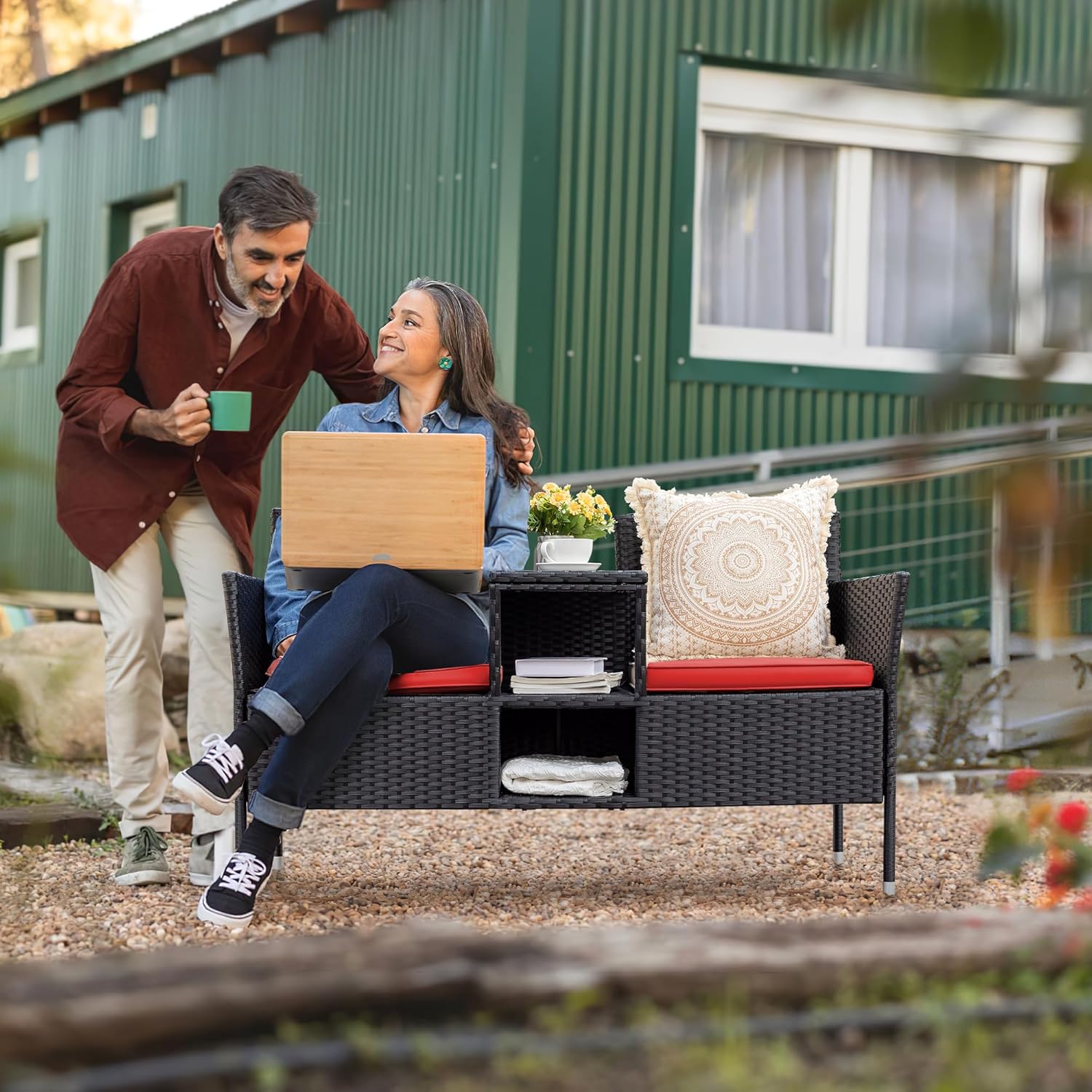 Flamaker Outdoor Furniture Patio Loveseat Wicker 2-Seat with Built-in Table and Cushions Rattan Porch Chairs Bench for Balcony, Lawn, Backyard (Red)