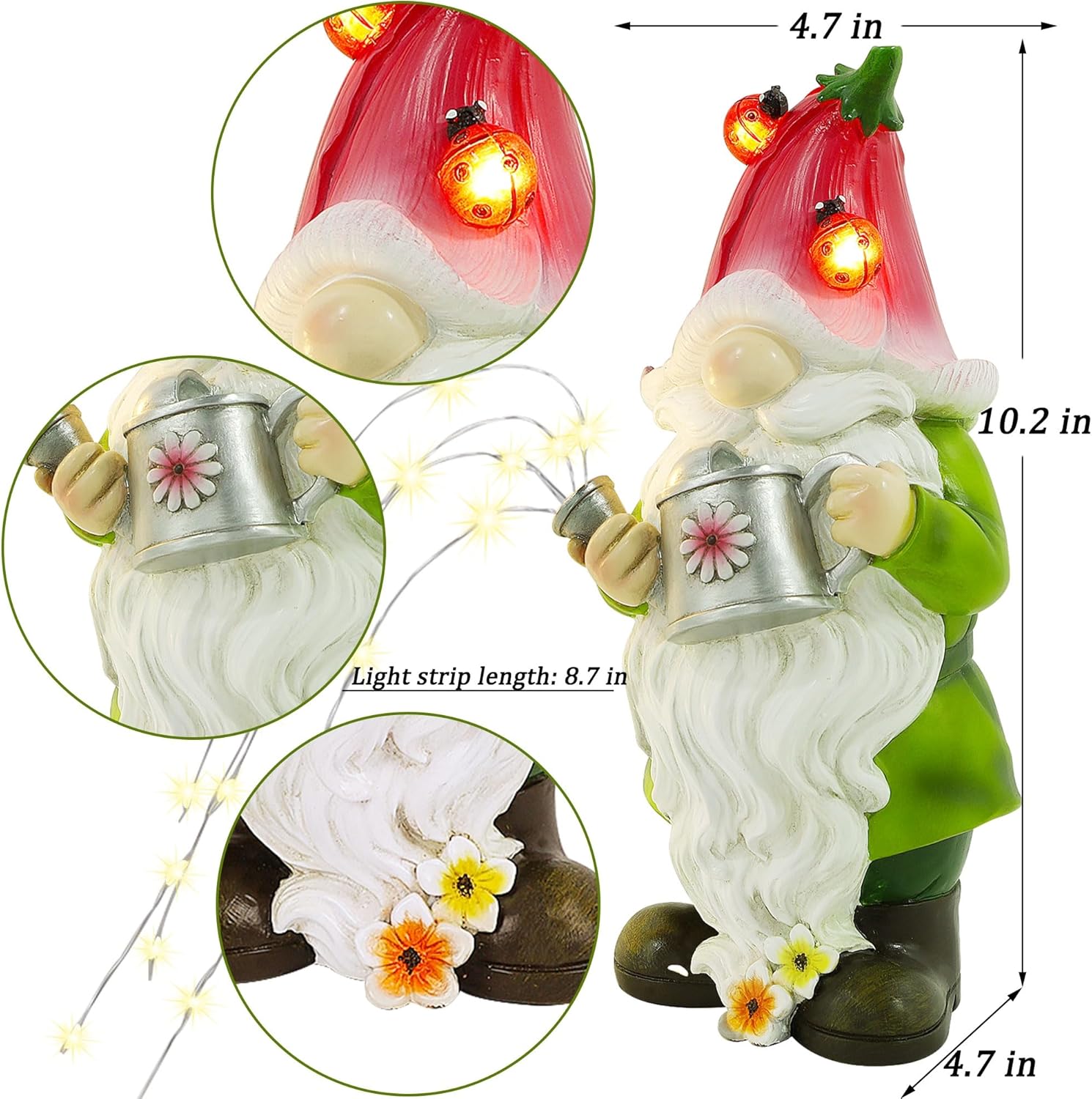 - LARGE GNOME FIGURINE: Measuring 10.2”H x 4.7"L x 4.7"W, Joliyoou crafts a cute gnome figurine holding a watering can for gardening. Adorned with small flowers on its long curly beard, the gnome wears a red flower as its hat on which there are even two adorable ladybirds, which brings the whole figurine wonderful tale colors.