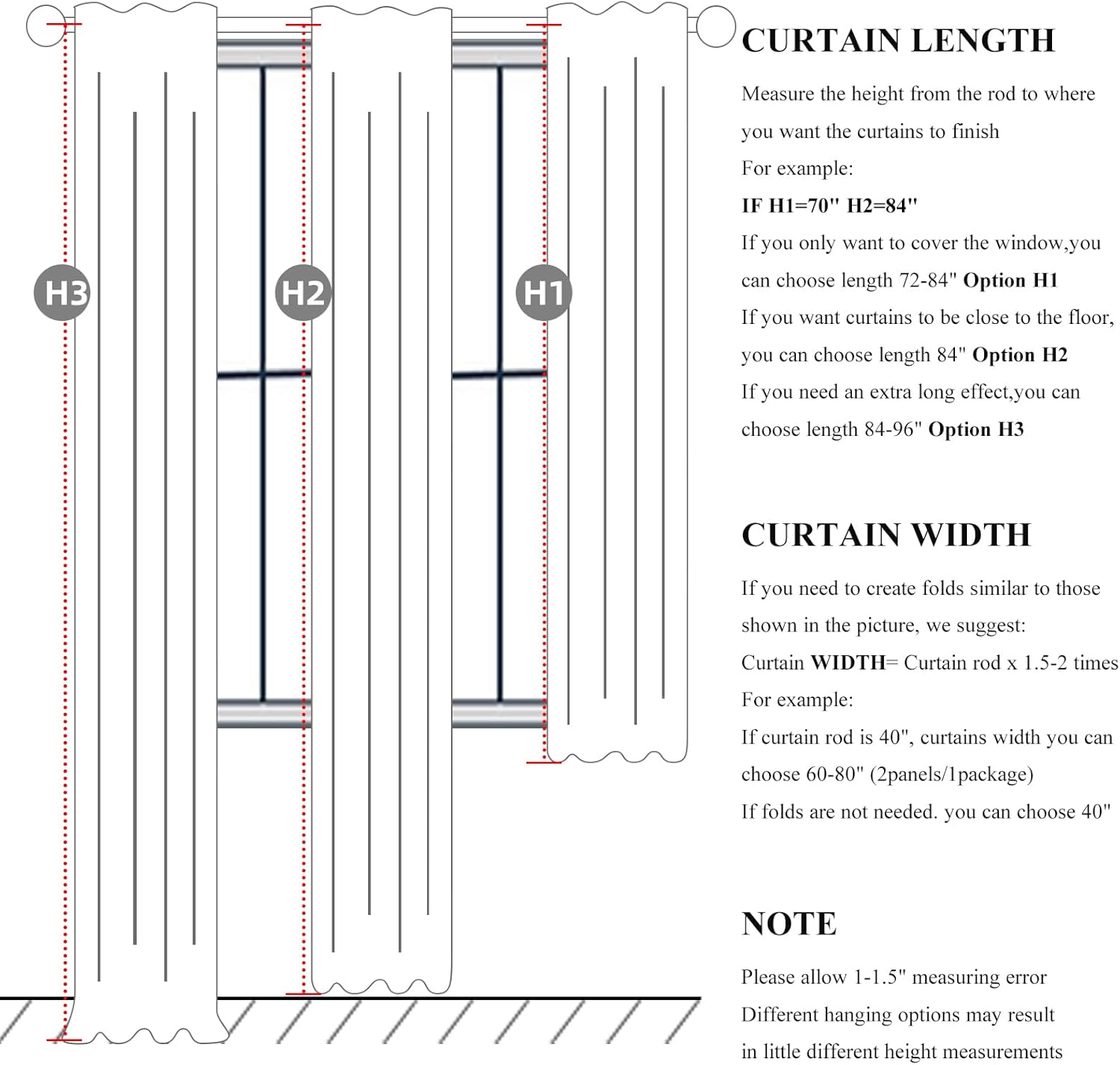 - Ready Made:Set of 2 pinch pleated curtain panels per package with 16 metal rings and 16 adjustable plastic hooks(The adjustable hook can raise and lower the height of the curtain by 1 inch),Each panel measures 40"W x 105"L,pair measures 80"W x 105"L