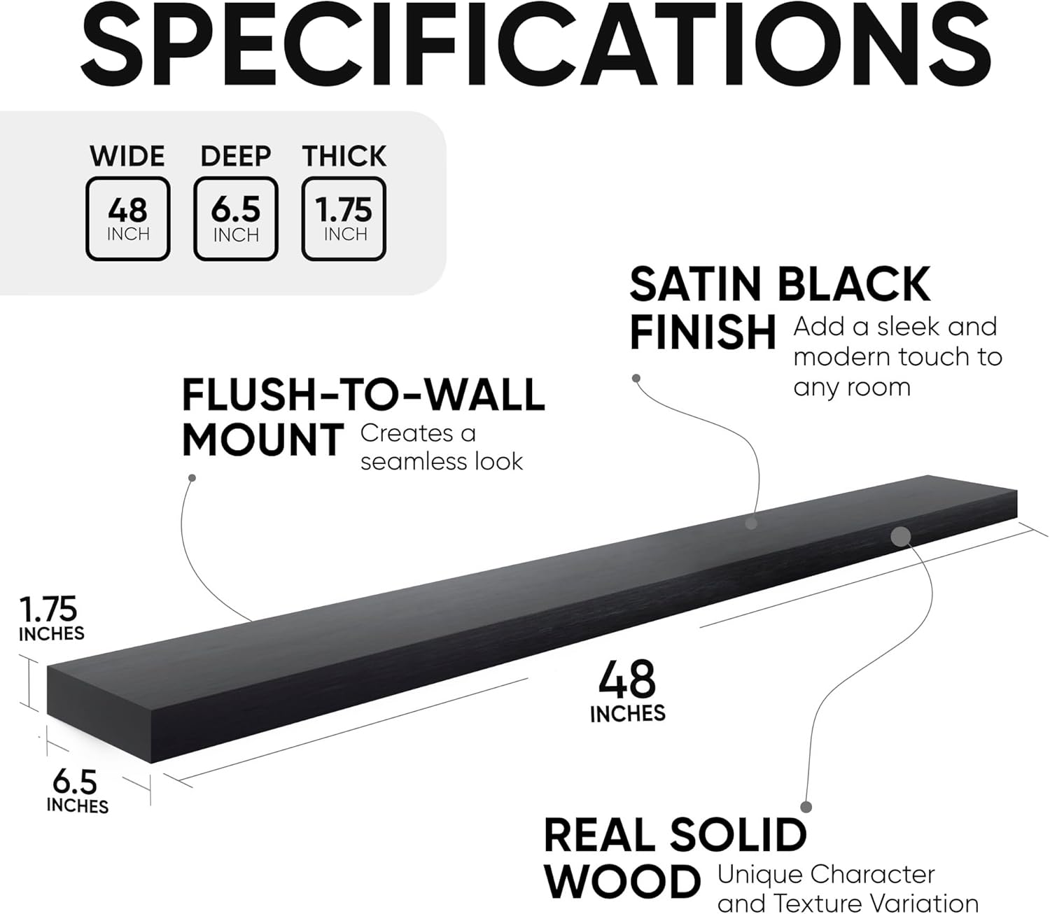 - AUTHENTIC WOOD GRAIN - Enjoy the timeless elegance of real wood. Handcrafted from the finest 1.75" Thick natural pine wood measuring 48" Wide x 6.5" Deep x 1.75". Our shelves highlight the inherent charm and durability of high-quality wood. Each Shelf reveals its unique character of knots and natural wood grain; each ledge is a little different but equally stunning.