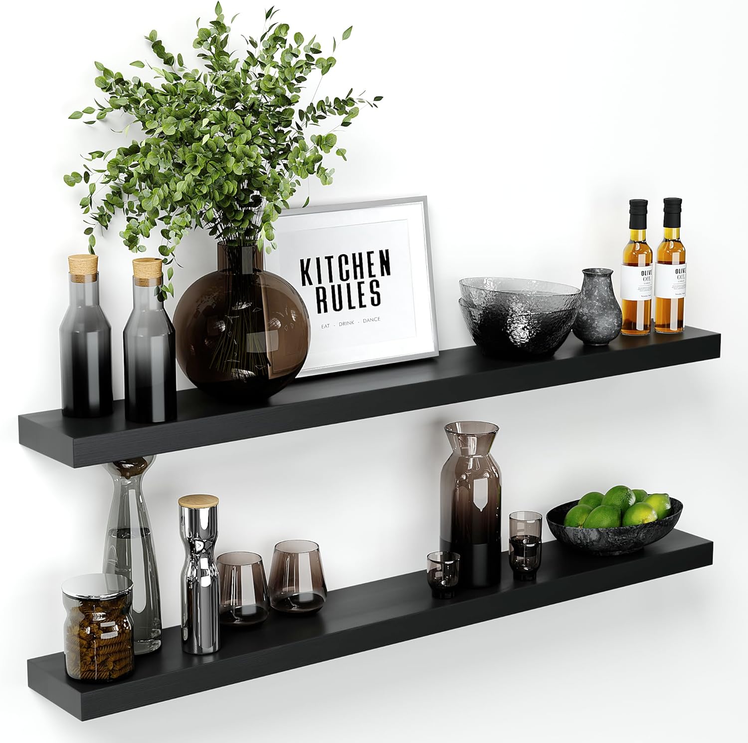 Homeforia Black Floating Shelf 48 inches, High End Solid Real Wood 48 inch Long Floating Shelves for Wall, Black Wooden 48inch Large Floating Shelves, Heavy Duty Bracket, 48 X 6.5 X 1.75 in, Set of 2