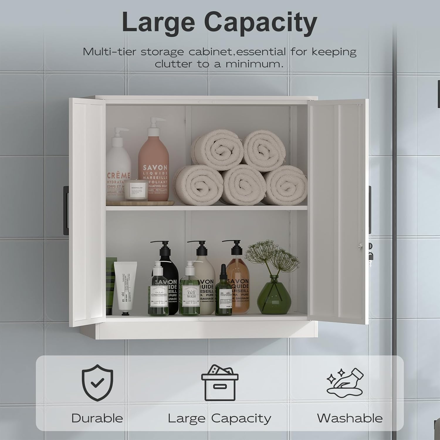 - 【Sturdy Steel Construction】The white wall cabinet is made of pure steel, sturdy and durable. All steel plates are treated with environmentally friendly powder coating, waterproof and corrosion resistant for easy cleaning. Further extend the service life.