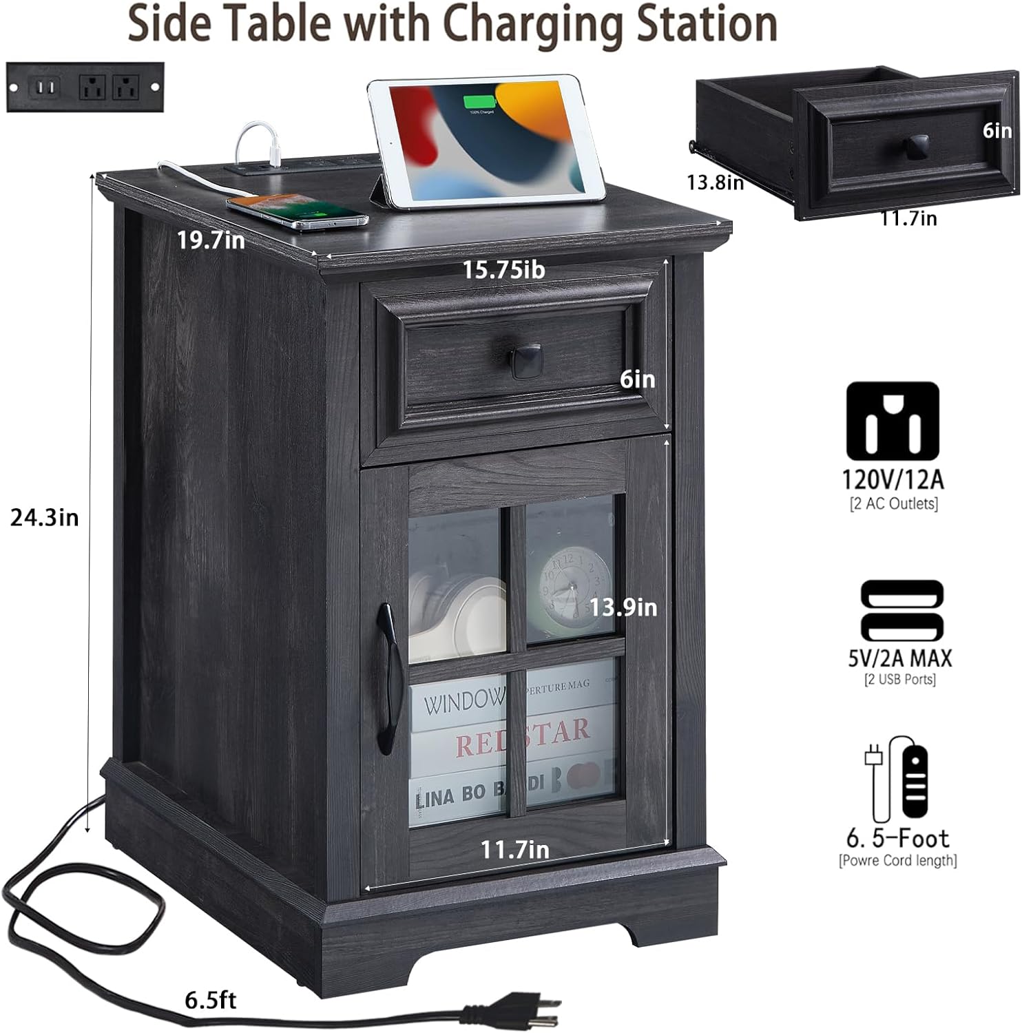 Farmhouse XXL End Table with Charging Station, Side Table with USB Ports and Outlets, Nightstand with Drawer and Glass Door Storage, Grey Bedside Tables for Living Room, Bedroom, Office