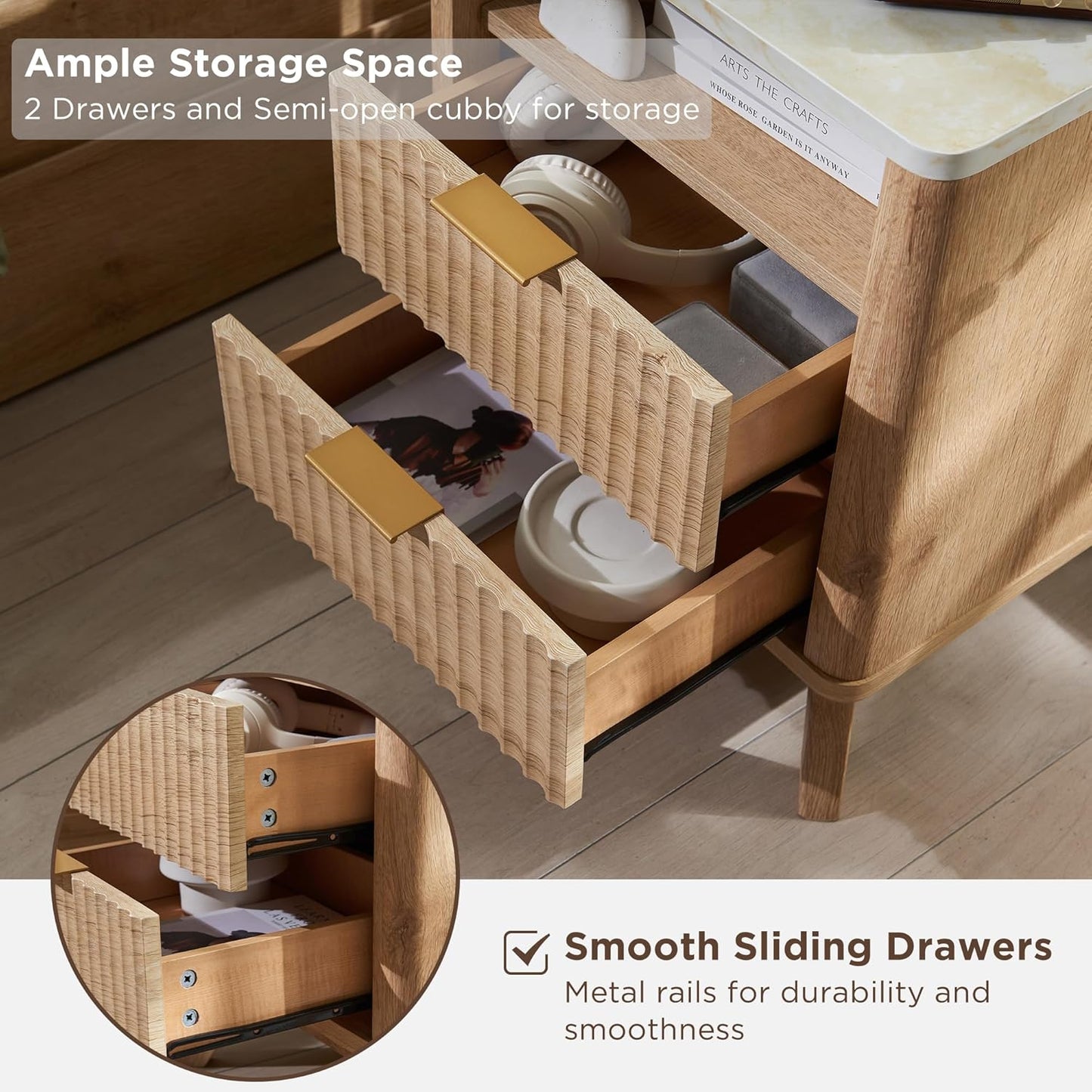 T4TREAM Fluted Nightstand with Charging Station, 18" Modern Side Table with Faux Marble Top, 2 Drawers End Table w/Storage, Bedside Table for Bedroom, Living Room, Curved Profile Design, Natural Oak