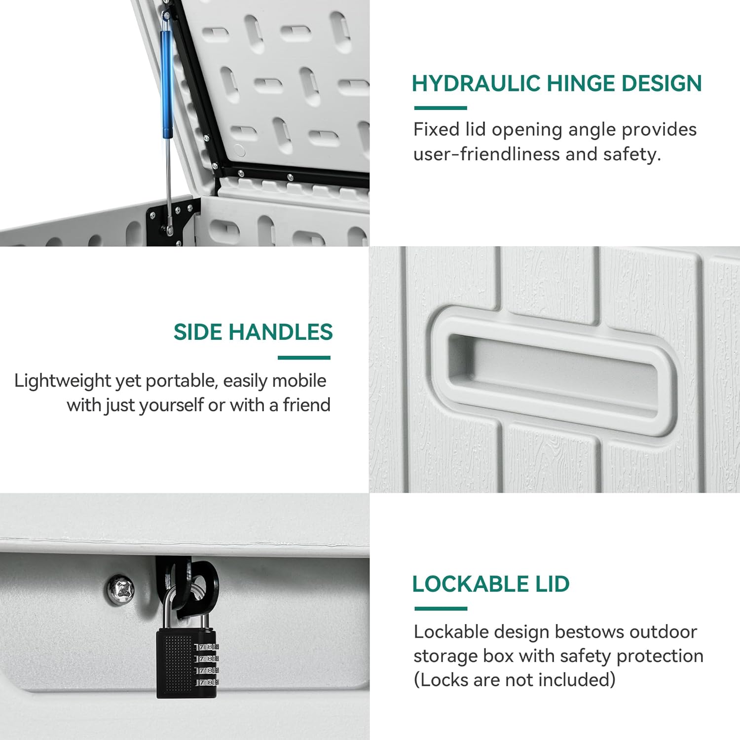 - Large 260-Gallon Capacity: The patio storage box measures 69.69''L x 32.28''W x 32.68'', spacious enough to store various items such as cushions, tools, supplies