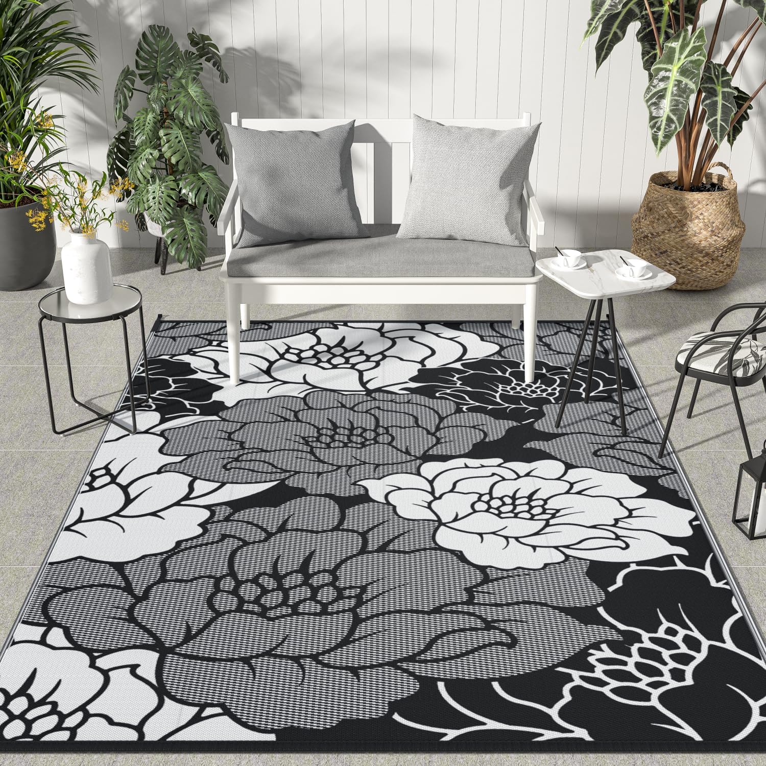 GENIMO Outdoor Rug Waterproof for Patio Decor, 8' x 10' Reversible Plastic Straw Floral Camping Carpet, Large Area Rugs Mats for RV, Camper, Deck, Balcony, Porch, Beach, Picnic, Mix-Black & White
