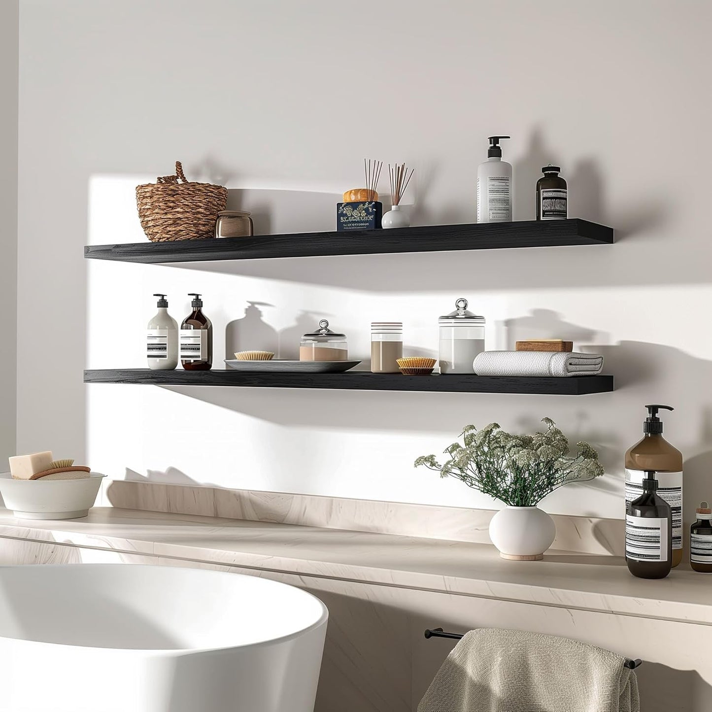 Wood Floating Shelves for Wall Decor, Rustic Wall Shelves for Bedroom Bathroom Kitchen Living Room, Set of 4 Black 48 Inch