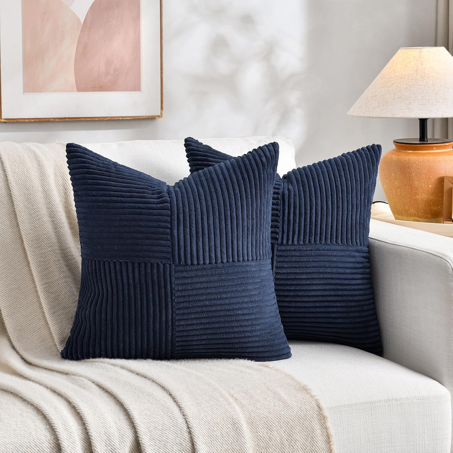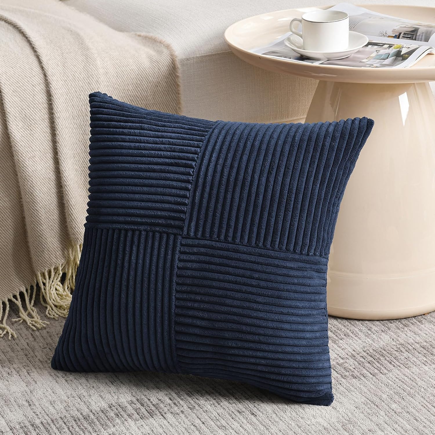 Fancy Homi 2 Packs Navy Blue Samll Decorative Throw Pillow Covers 14x14 Inch with for Couch Bed Sofa, Rustic Farmhouse Boho Home Decor, Soft Corss Patchwork Corduroy Square Cushion Case 35x35 cm